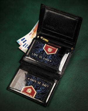 Šis maks ir ne tikai stilīgs, bet arī praktisks, ar pietiekami daudz vietas jūsu kartēm un skaidrai naudai. Iebūvētā RFID aizsardzība palīdzēs aizsargāt jūsu personas datus no neatļautas skenēšanas.