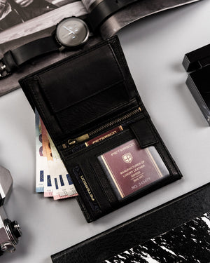 Šis elegantais un funkcionālais maks ir lieliska izvēle vīriešiem, kuri novērtē kvalitāti un drošību. Izgatavots no īstas ādas, tas ne tikai izskatās stilīgi, bet arī nodrošina izturību. Melnā krāsa nodrošina daudzpusību, padarot maku ideāli piemērotu jebkuram gadījumam. Pateicoties integrētajai RFID aizsardzībai, jūsu kartes tiks aizsargātas no nevēlamas skenēšanas. Ar 6-10 karšu nodalījumiem šis maks ir praktisks un ērts ikdienas lietošanai.