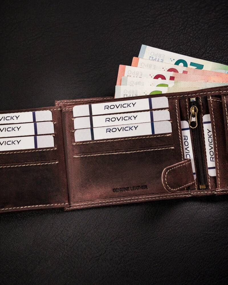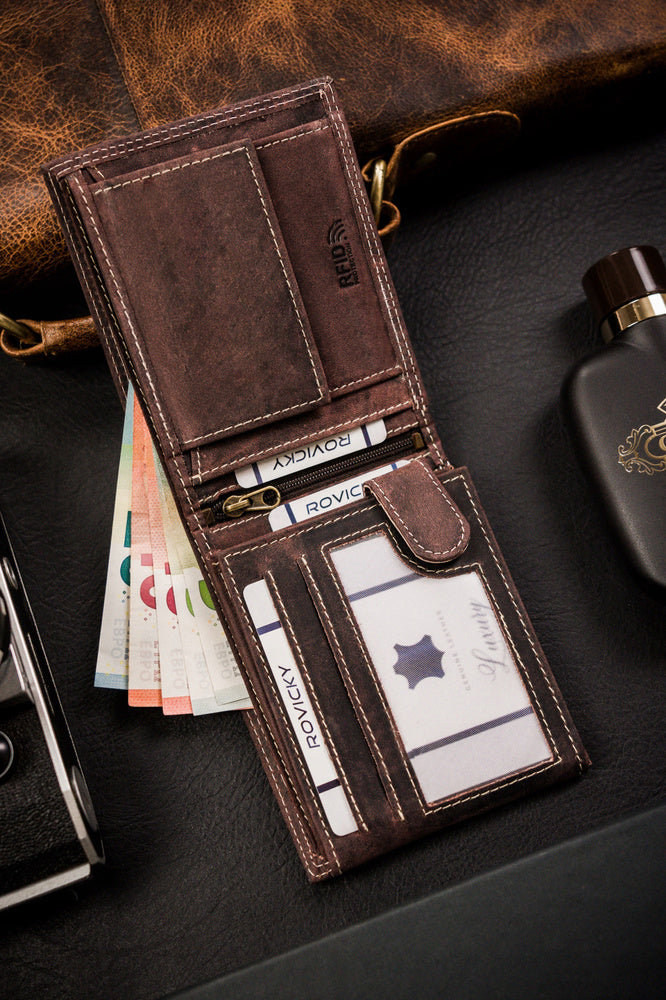Šis maks ir lieliska izvēle tiem, kas novērtē kvalitāti un drošību. Izgatavots no dabīgas zamšādas un nubuka ādas, tas ne tikai izskatās eleganti, bet arī nodrošina izturību. Tumši brūnā krāsa nodrošina klasisku un daudzpusīgu stilu, savukārt RFID aizsardzība palīdz aizsargāt jūsu kartes no nevēlamas skenēšanas.