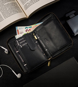 Šis elegantais un funkcionālais vīriešu maks ir lieliska izvēle tiem, kas novērtē kvalitāti un drošību. Izgatavots no īstas ādas, tas nodrošina izturību un stilīgu izskatu. Melnā krāsa nodrošina daudzpusību, tāpēc maks lieliski iederēsies jebkurā stilā. Pateicoties integrētajai RFID aizsardzībai, jūsu kartes tiks pasargātas no nevēlamas skenēšanas. Ar 6-10 karšu nodalījumiem šis maks nodrošina pietiekami daudz vietas visiem jūsu svarīgajiem dokumentiem un kartēm. Tā izmēri - 13,5 cm x 11 cm x 2 cm - ļauj ērti uzglabāt maku kabatā vai somā.