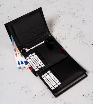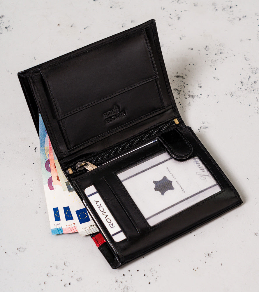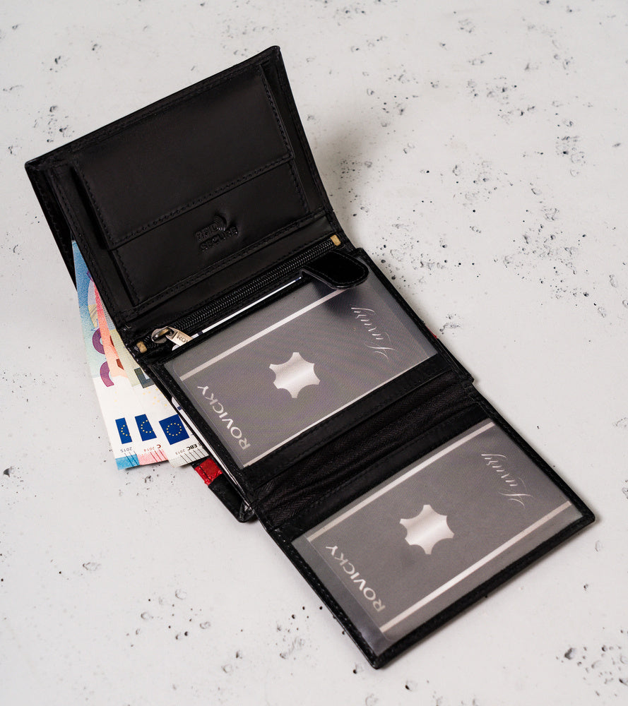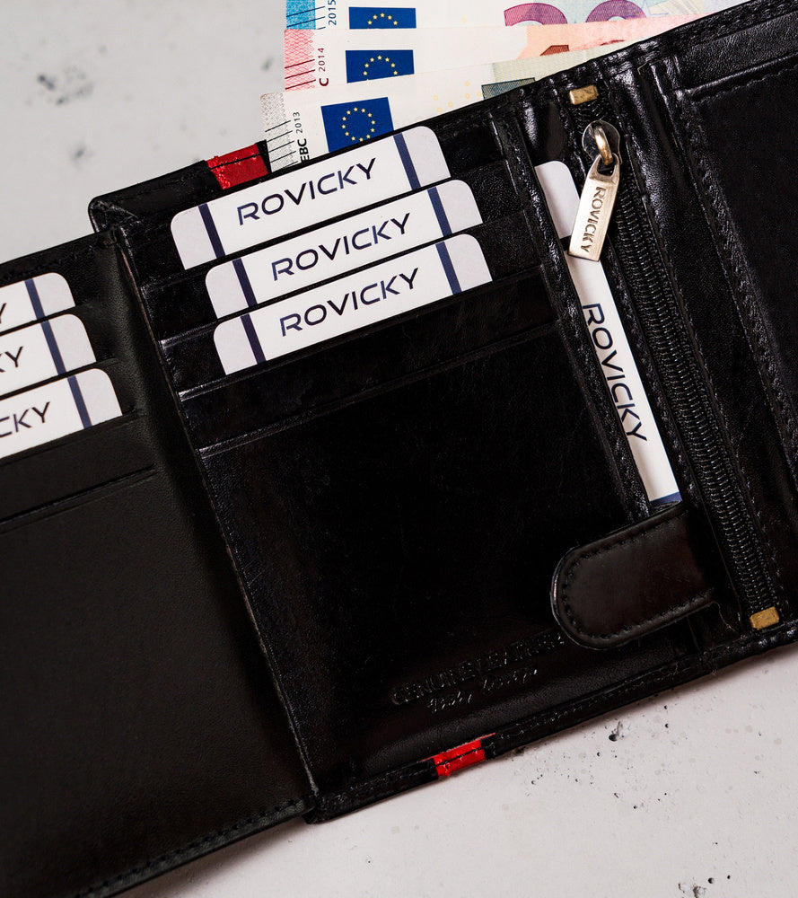 Vīriešu ādas maks Rovicky RV111 ir elegants un funkcionāls aksesuārs, kas izgatavots no augstas kvalitātes īstas ādas. Šim makam ir moderns dizains, un tas ir pieejams divās krāsās: melnā un sarkanā. Pateicoties lielajam izmēram, tas ir lieliski piemērots tiem, kas novērtē plašumu un ērtības.