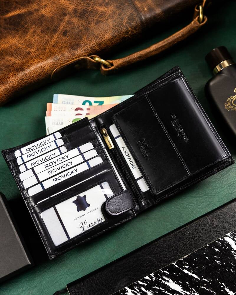 Šis elegantais vīriešu maks no Rovicky ir izgatavots no augstas kvalitātes īstas ādas, kas nodrošina izturību un stilīgu izskatu. Melnā krāsa piešķir tam klasisku un daudzpusīgu izskatu, kas piemērots jebkuram gadījumam.