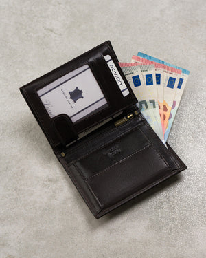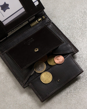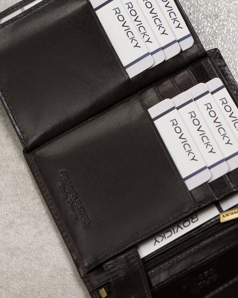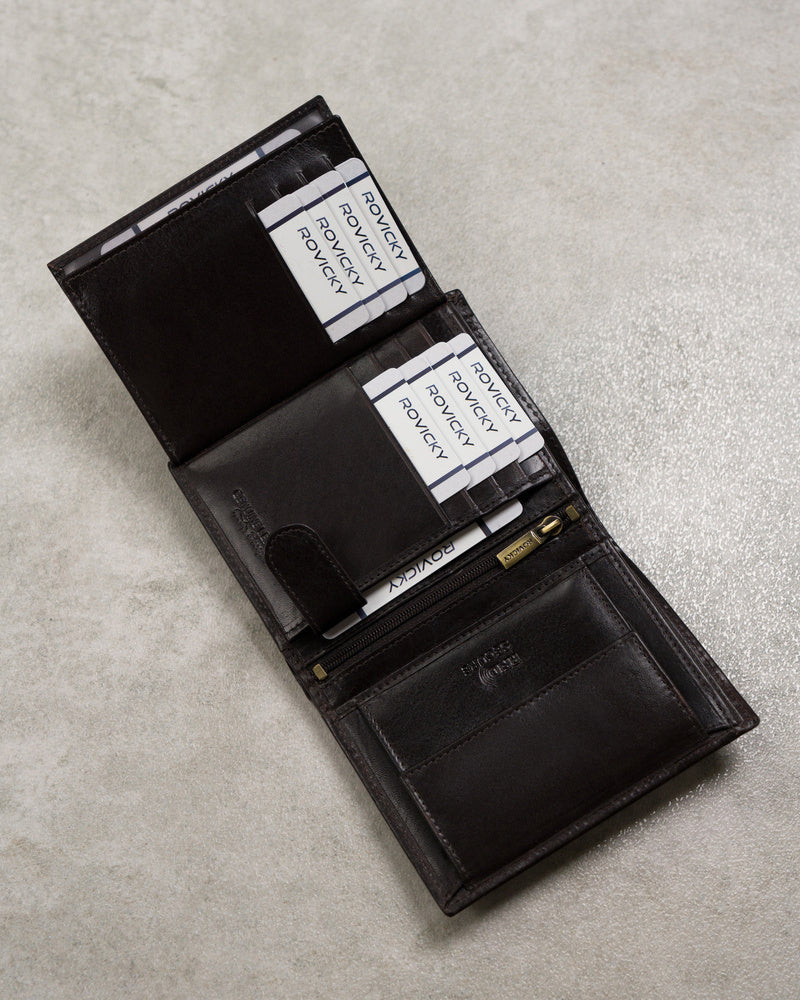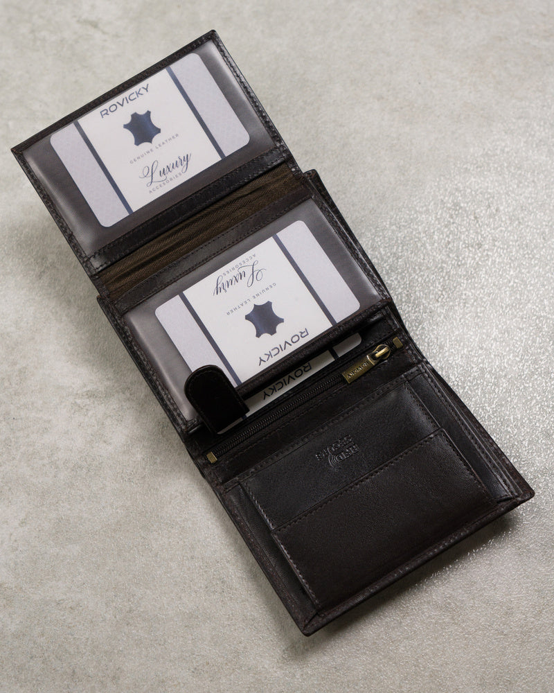 Šis vīriešu maks no Rovicky ir izgatavots no augstas kvalitātes īstas ādas, kas nodrošina izturību un eleganci. Tumši brūnā krāsa piešķir tam klasisku un stilīgu izskatu.