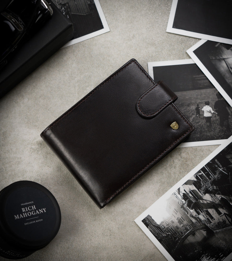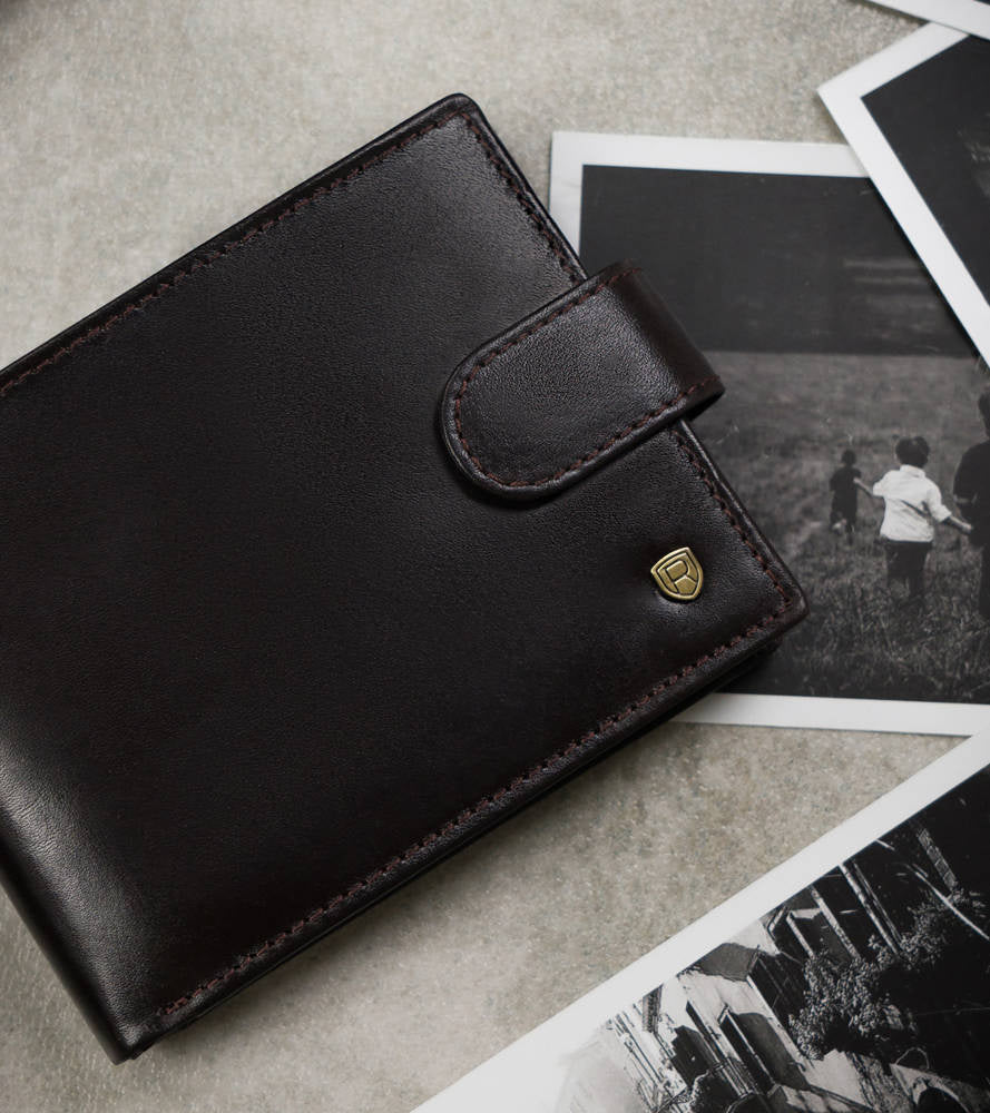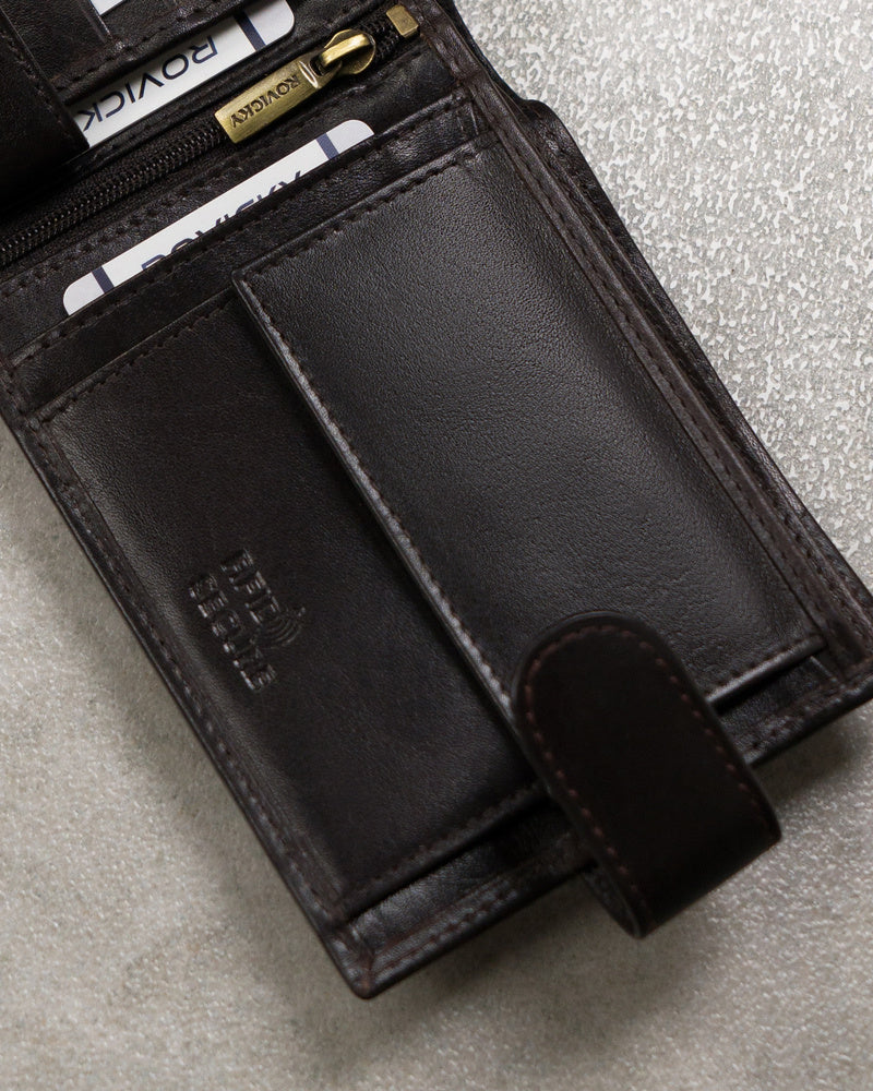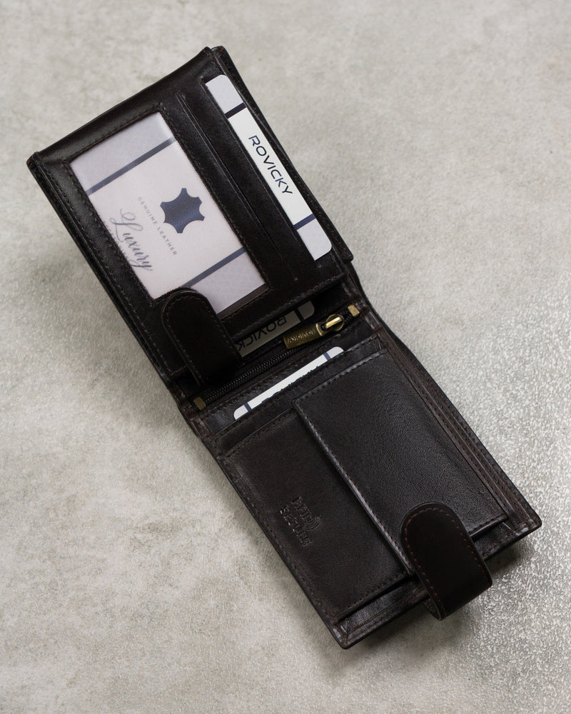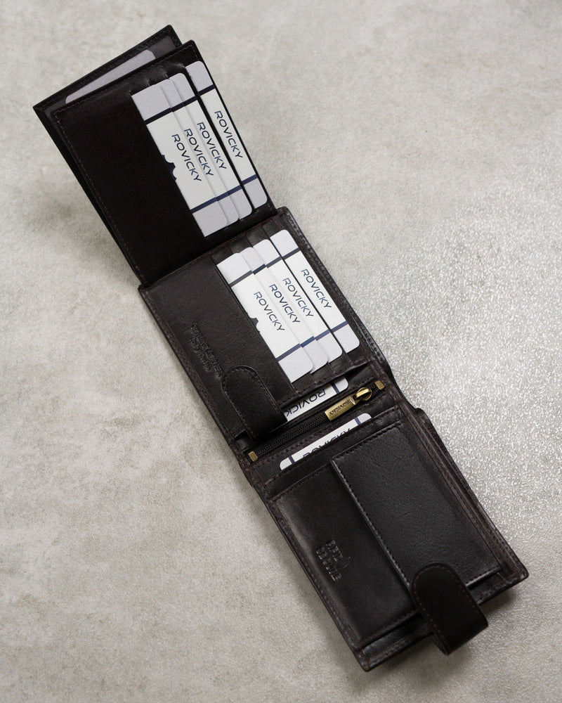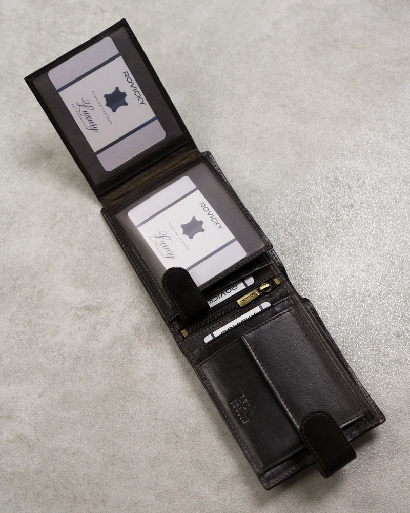 Šis vīriešu maks no Rovicky kolekcijas ir izgatavots no augstas kvalitātes īstas ādas, kas nodrošina izturību un eleganci. Tumši brūnā krāsa piešķir klasisku un stilīgu izskatu.