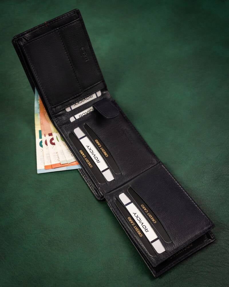 Šis elegantais vīriešu maks no Rovicky ir izgatavots no augstas kvalitātes īstas ādas, kas nodrošina izturību un stilīgu izskatu. Tumši zilā krāsa piešķir makam atšķirīgu un daudzpusīgu izskatu, kas labi sader ar dažādiem apģērba stiliem.
