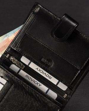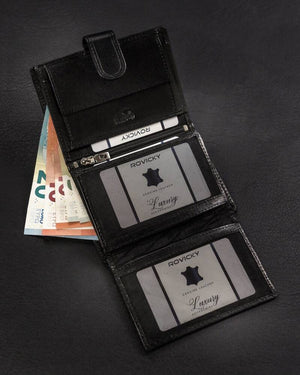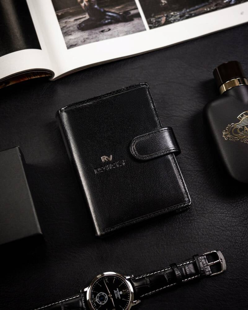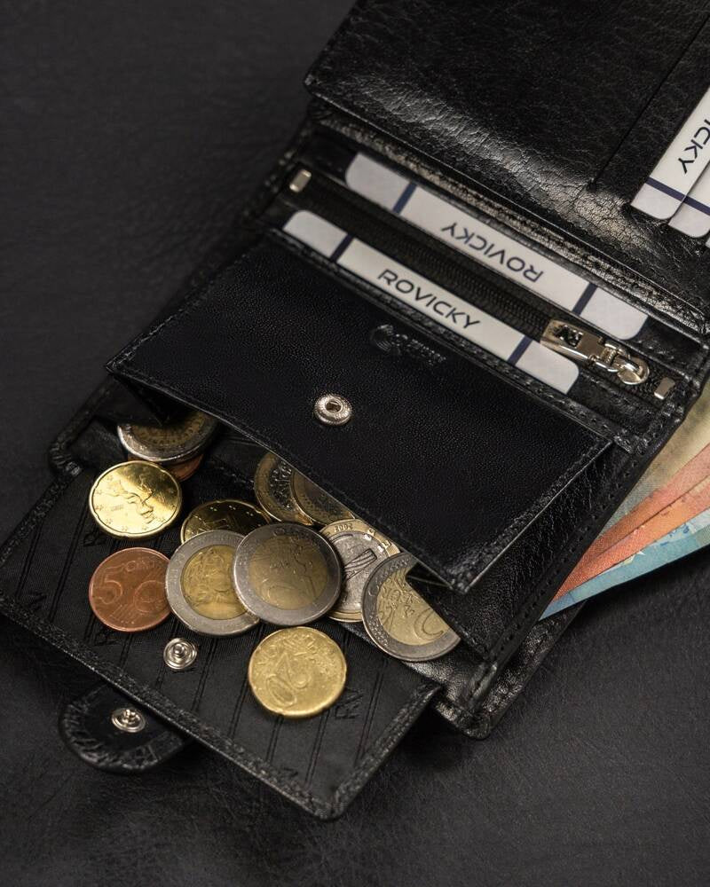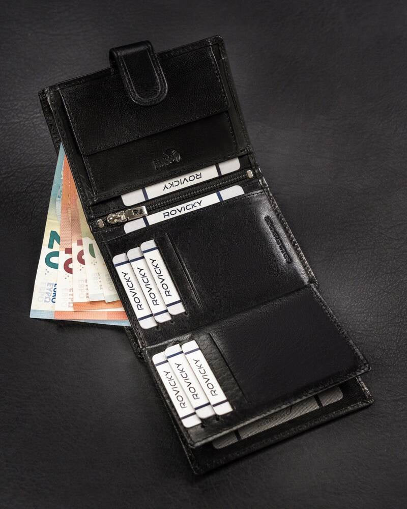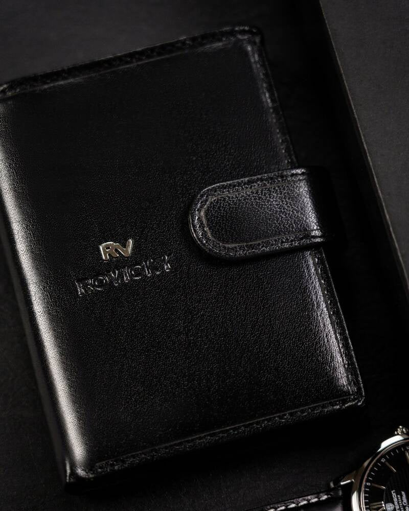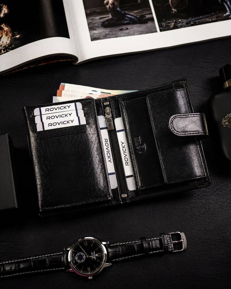 Šis elegantais vīriešu maks no Rovicky ir izgatavots no augstas kvalitātes īstas ādas, kas nodrošina izturību un stilīgu izskatu. Melnā krāsa piešķir tam klasisku un daudzpusīgu izskatu, kas piemērots jebkuram gadījumam.