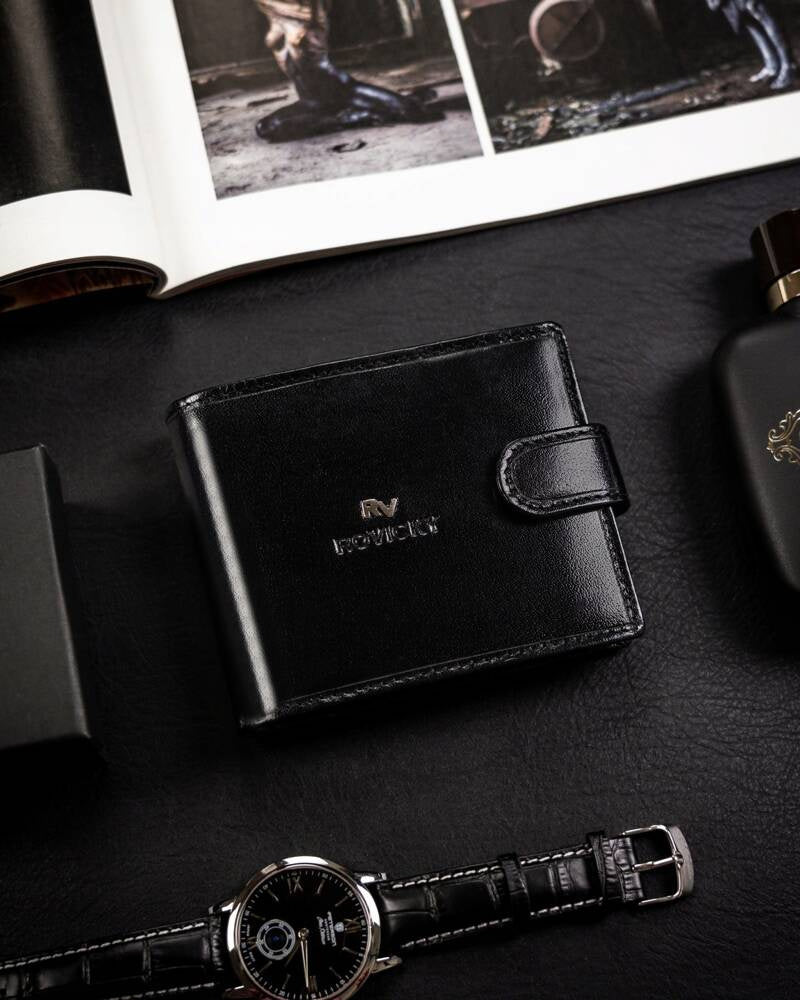 Šis elegantais vīriešu maks no Rovicky ir izgatavots no augstas kvalitātes īstas ādas, kas nodrošina izturību un stilīgu izskatu. Melnā krāsa piešķir tam klasisku un daudzpusīgu izskatu, kas piemērots jebkuram gadījumam.