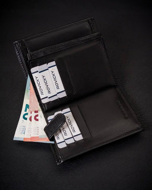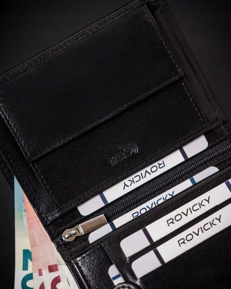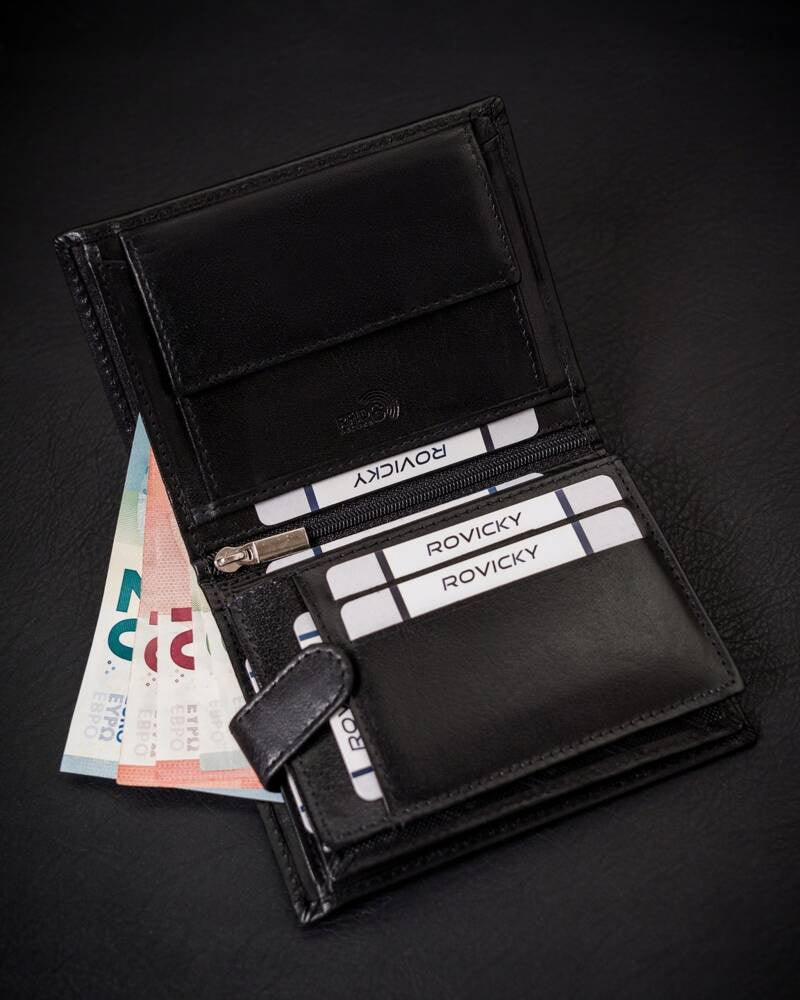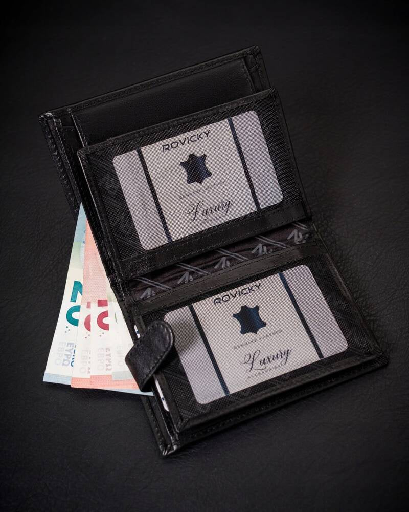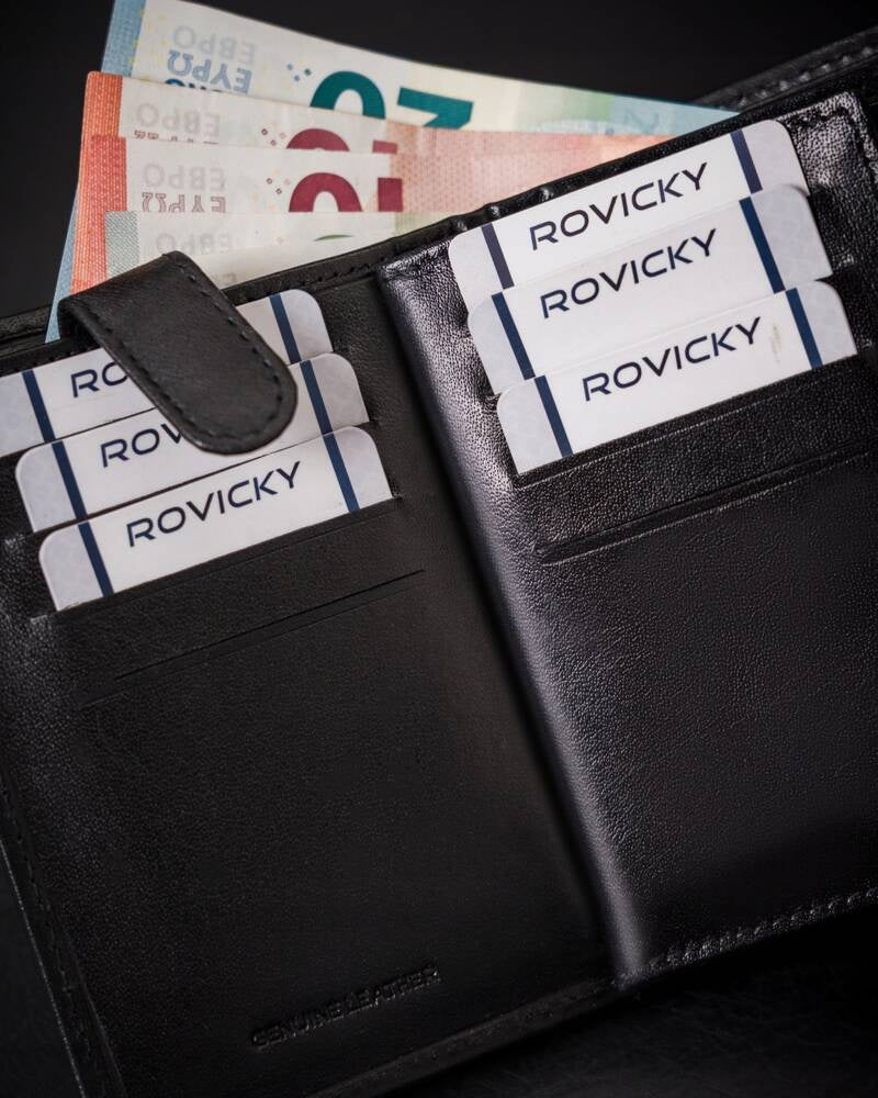 Šis elegantais vīriešu maks no Rovicky ir izgatavots no augstas kvalitātes īstas ādas, kas nodrošina izturību un stilīgu izskatu. Melnais dizains piešķir tam klasisku un daudzpusīgu izskatu, kas piemērots jebkuram gadījumam.