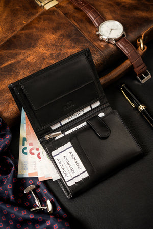 Šis elegantais vīriešu maks no Rovicky ir izgatavots no augstas kvalitātes īstas ādas, kas nodrošina izturību un stilīgu izskatu. Melnā krāsa piešķir tam klasisku un daudzpusīgu izskatu, kas piemērots jebkuram gadījumam.