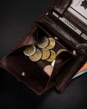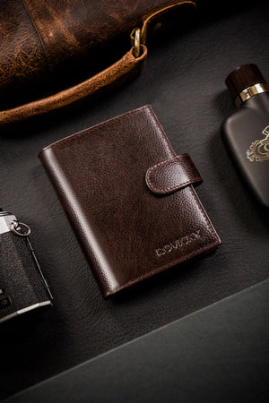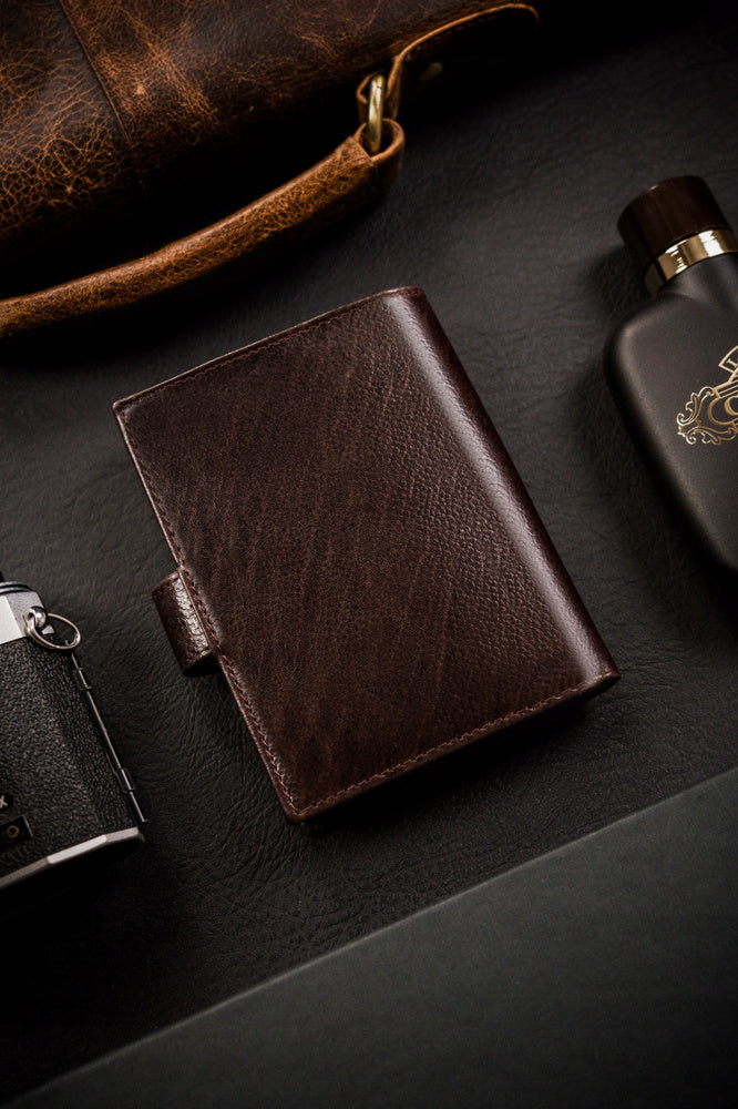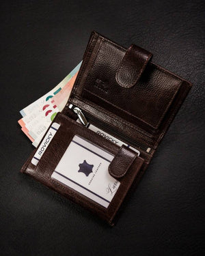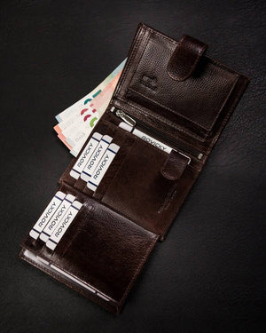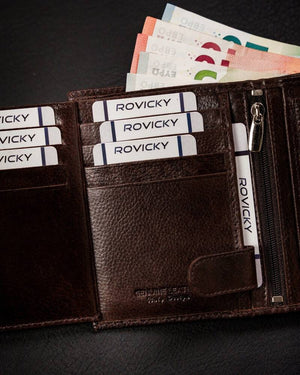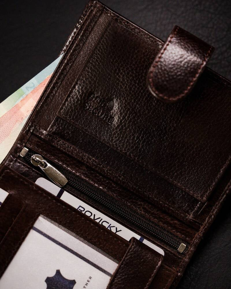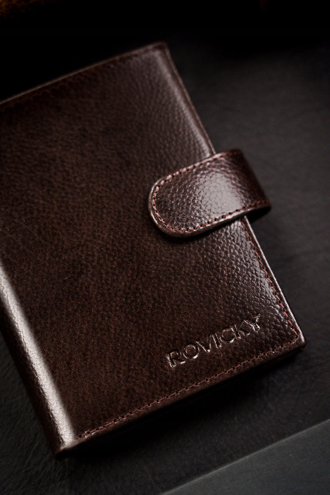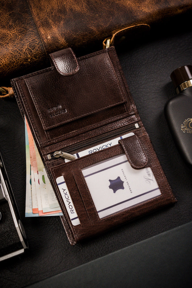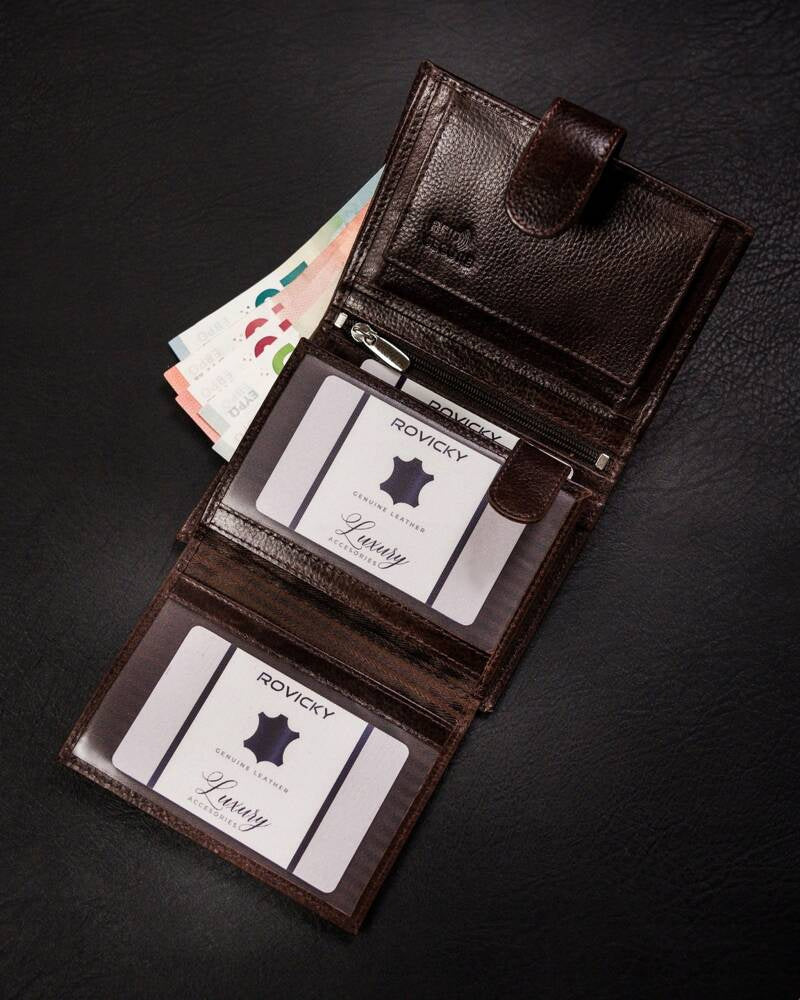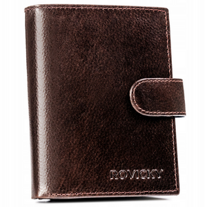 Šis vīriešu maks Rovicky RV224 ir izgatavots no augstas kvalitātes īstas ādas, kas nodrošina izturību un eleganci. Brūnais dizains piešķir klasisku un stilīgu izskatu, kas labi sader ar dažādiem apģērba stiliem.