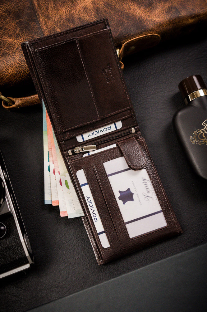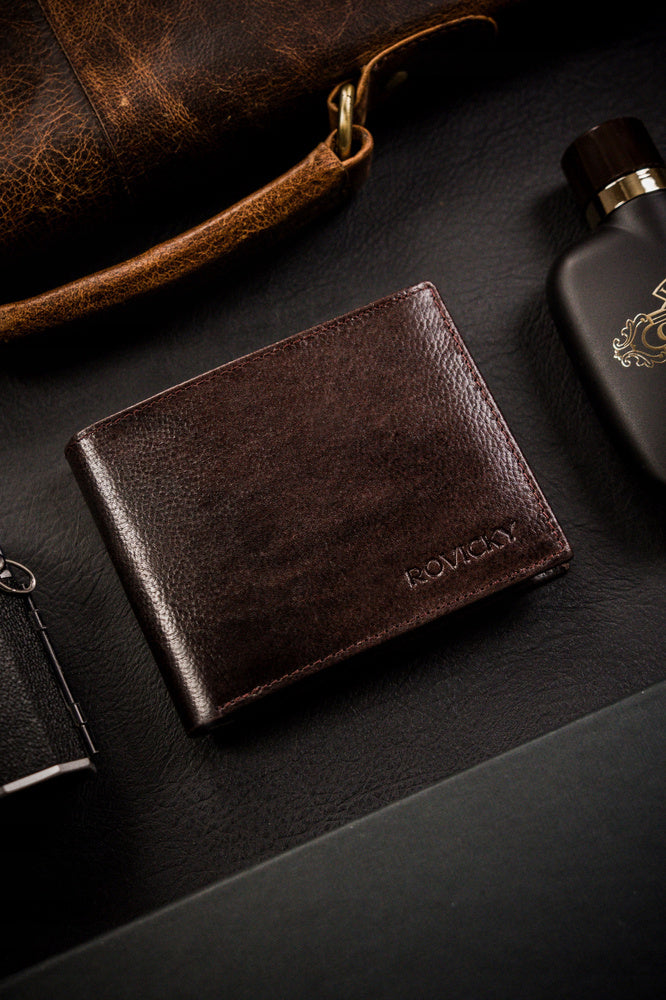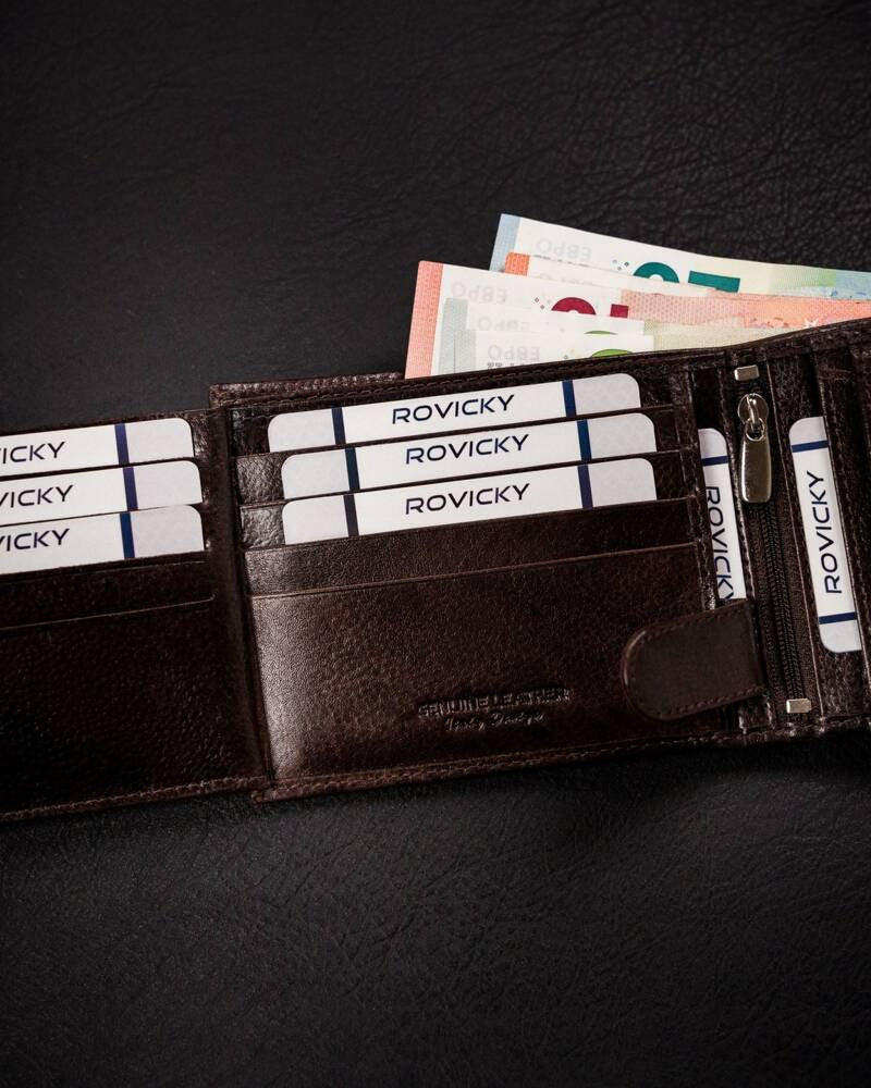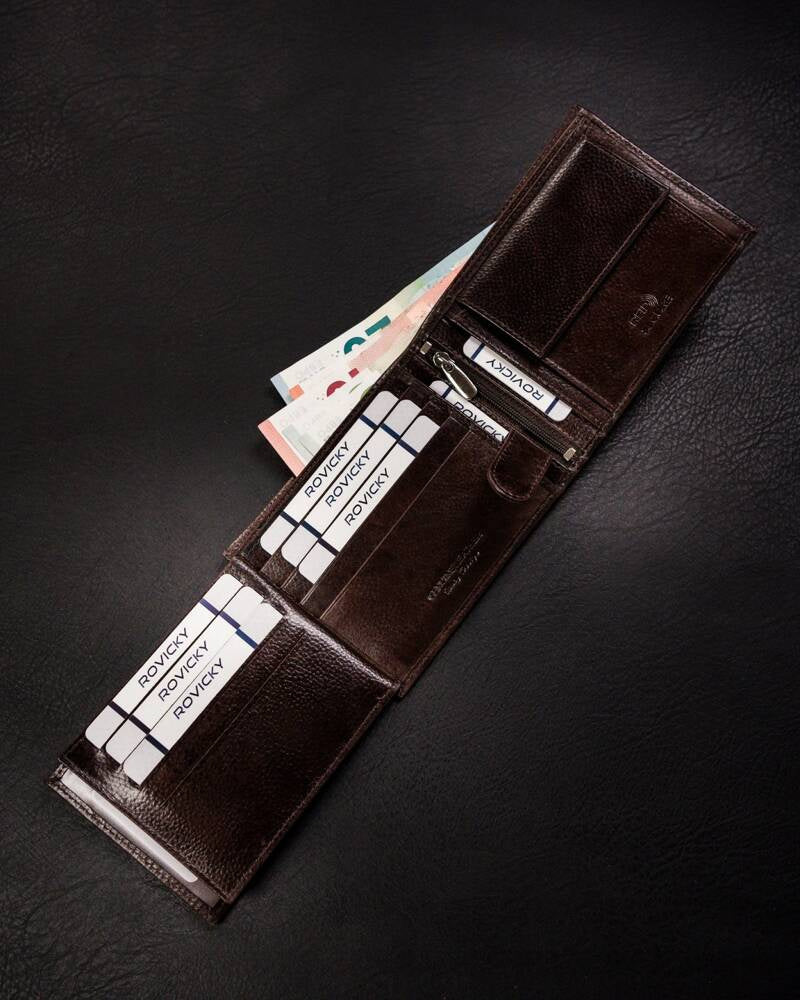 Šis vīriešu ādas maks Rovicky RV232 ir lieliska izvēle tiem, kas novērtē kvalitāti un funkcionalitāti. Izgatavots no īstas ādas, tas ir eleganti brūnā krāsā un ar lielu izmēru, kas nodrošina pietiekami daudz vietas jūsu kartēm un skaidrai naudai. Makam ir 6-10 karšu nodalījumi, un tas ir aprīkots ar RFID aizsardzību, kas palīdz aizsargāt jūsu datus no neatļautas skenēšanas. Tā kompaktie izmēri - 9,5 cm x 12,5 cm x 2 cm - ļauj to ērti nēsāt katru dienu.