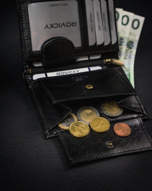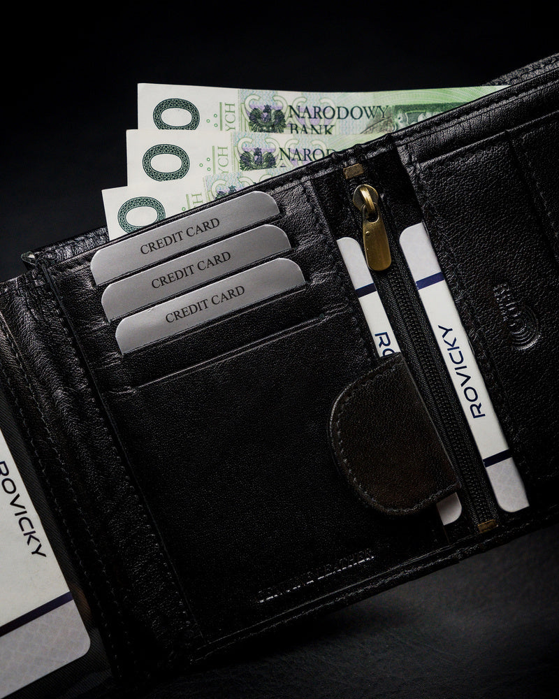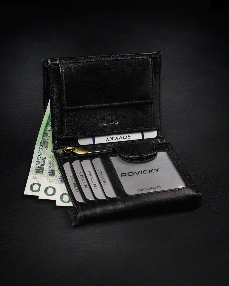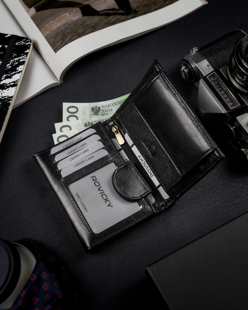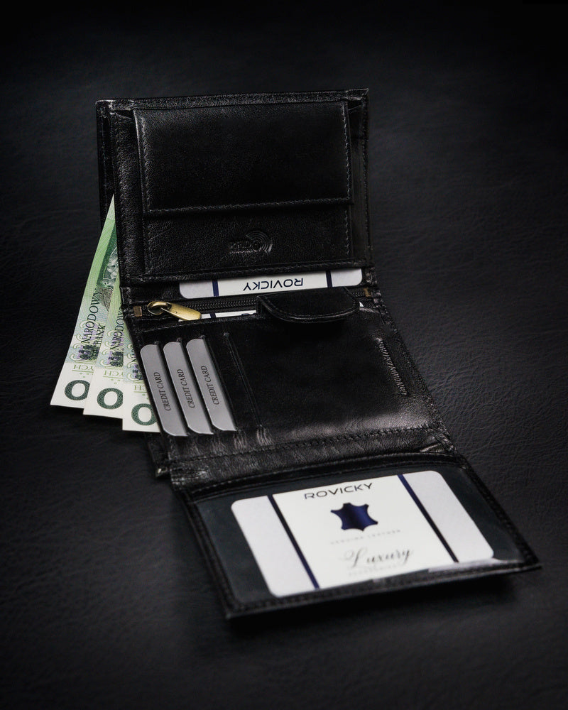 Šis elegantais vīriešu maks no Rovicky kolekcijas ir izgatavots no augstas kvalitātes īstas ādas, nodrošinot izturību un stilīgu izskatu.