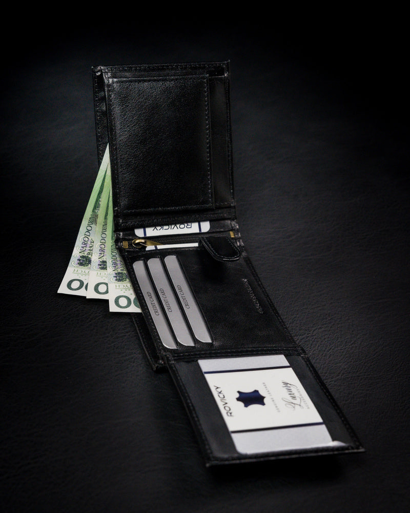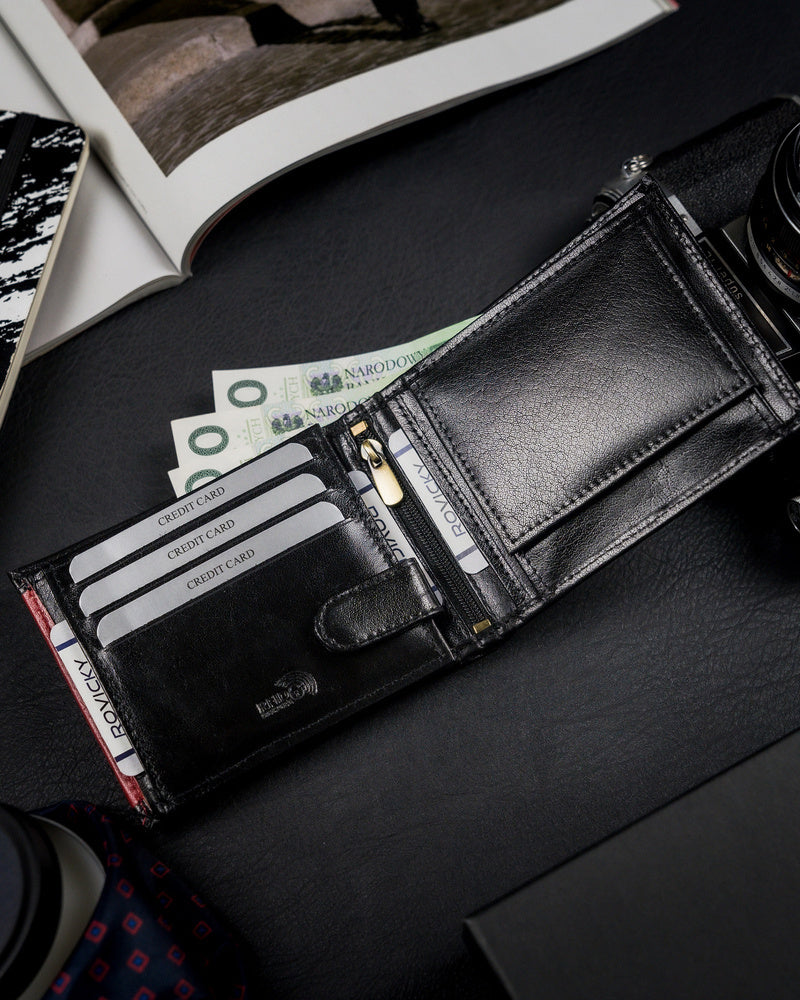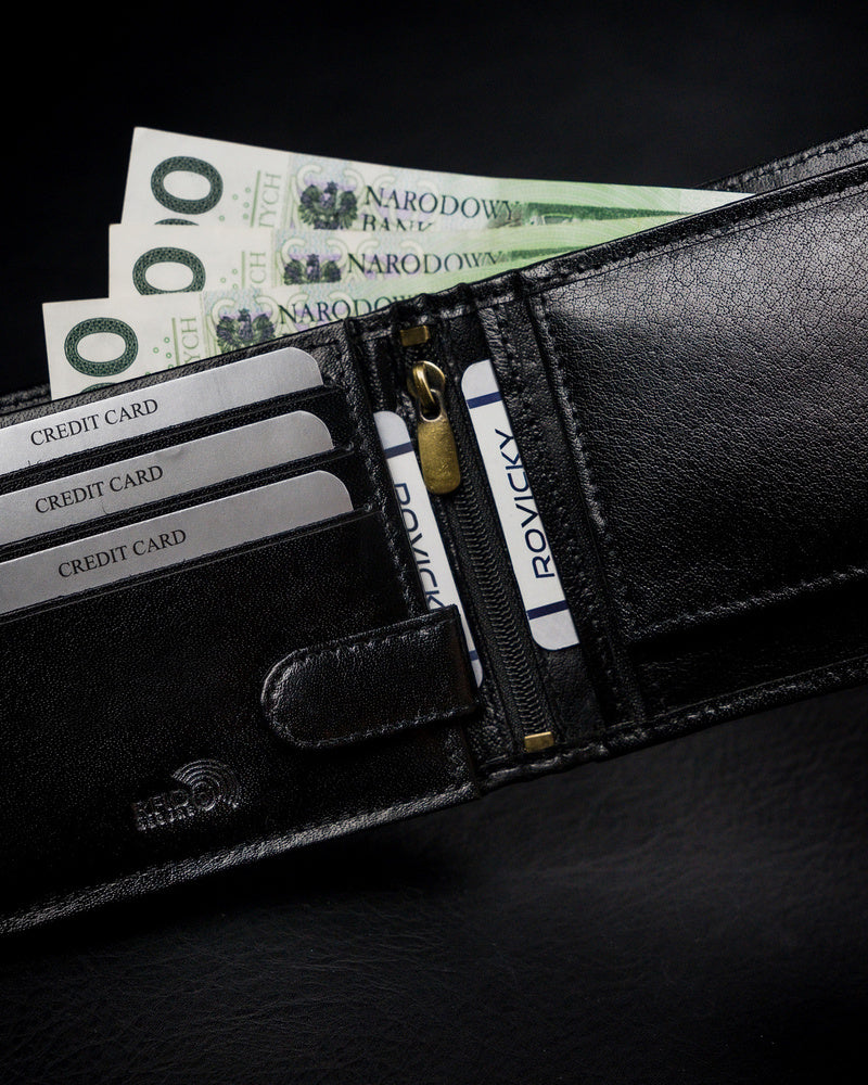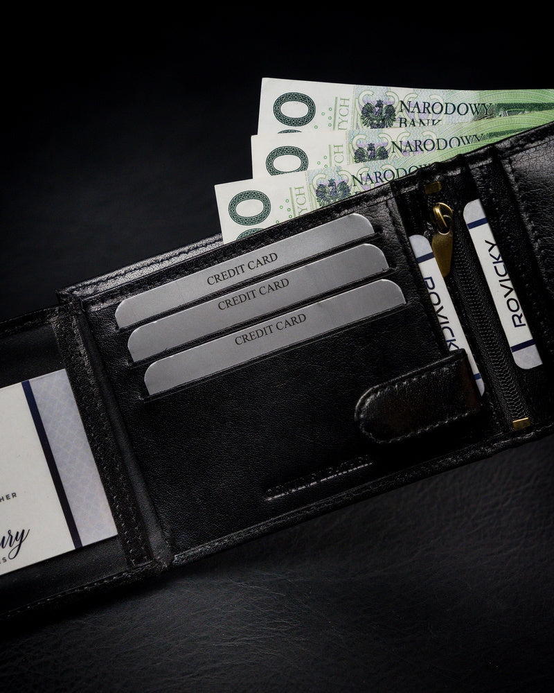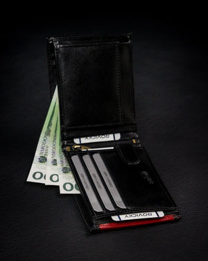 Vīriešu ādas maks Rovicky RV56 ir elegants un funkcionāls aksesuārs, kas izgatavots no augstas kvalitātes dabīgas pilngraudu ādas. Šis maks ir ne tikai stilīga dizaina, bet arī praktisks, ar 6-10 karšu nodalījumiem. Pateicoties integrētajai RFID aizsardzībai, jūsu kartes būs pasargātas no nevēlamas skenēšanas. Izvēlieties vienu no divām klasiskām krāsām - melnu vai sarkanu - un izbaudiet ērtības un drošību katru dienu.
