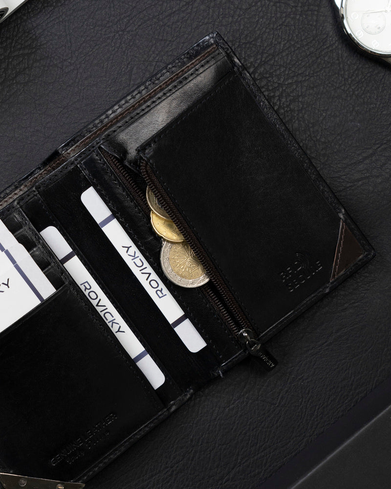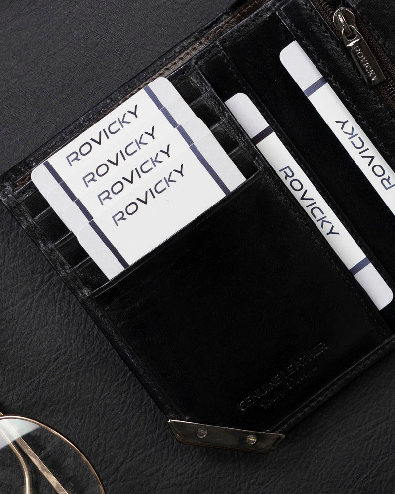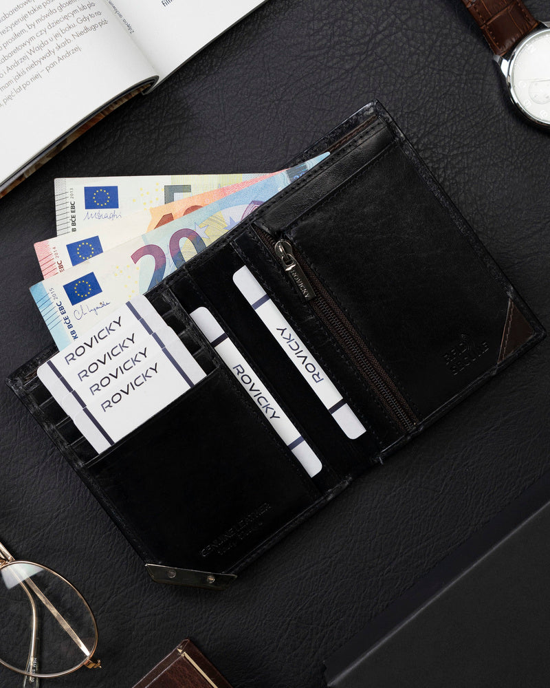 Vīriešu ādas maks Rovicky RV59 ir eleganta un funkcionāla izvēle, kas izgatavota no augstas kvalitātes īstas ādas. Melnā krāsa nodrošina klasisku un daudzpusīgu stilu, kas piemērots dažādiem gadījumiem. Makam ir liels izmērs, tāpēc tajā ērti ietilps visas jūsu kartes un skaidra nauda. Ar vairāk nekā 10 karšu nodalījumiem un RFID aizsardzību jūsu personas dati būs drošībā. Kompaktie izmēri ļauj ērti nēsāt maku kabatā vai somā.