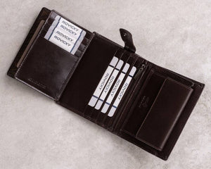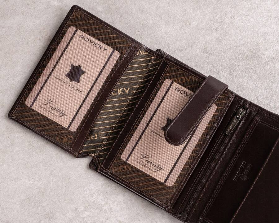 Šis vīriešu maks no Rovicky kolekcijas ir izgatavots no augstas kvalitātes īstas ādas, kas nodrošina izturību un eleganci. Brūnais dizains piešķir klasisku un stilīgu izskatu.