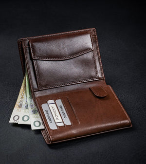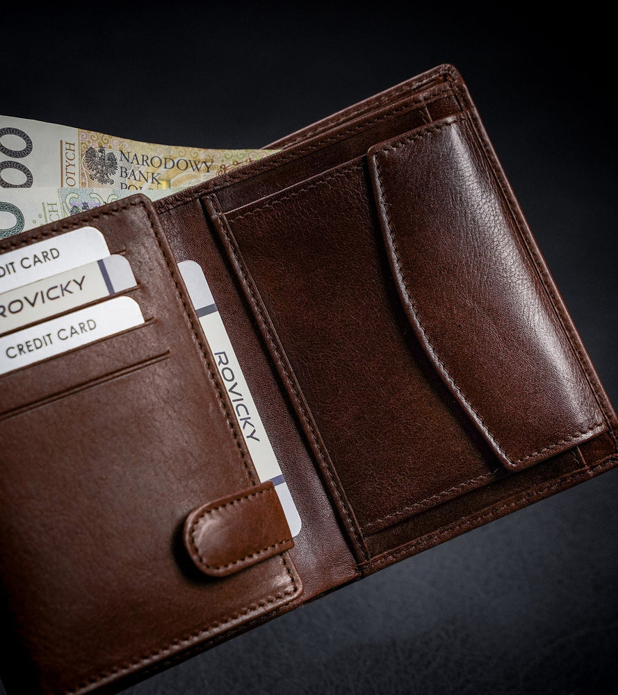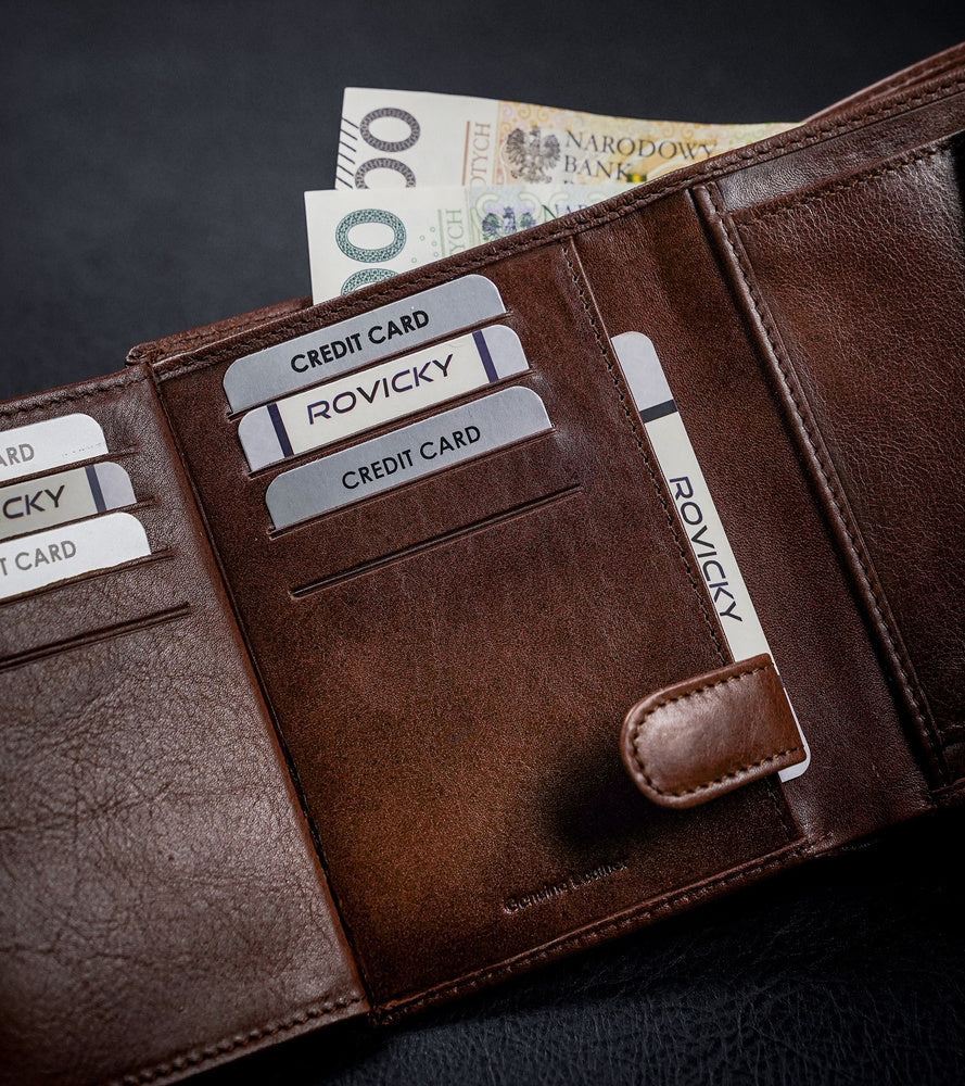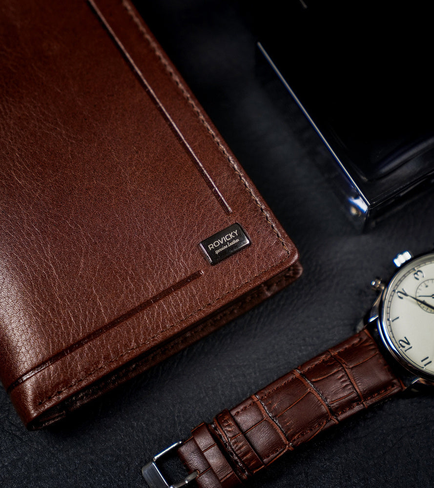 Šis Rovicky vīriešu maks ir izgatavots no augstas kvalitātes īstas ādas, kas nodrošina izturību un eleganci. Brūnais dizains piešķir tam klasisku un stilīgu izskatu.