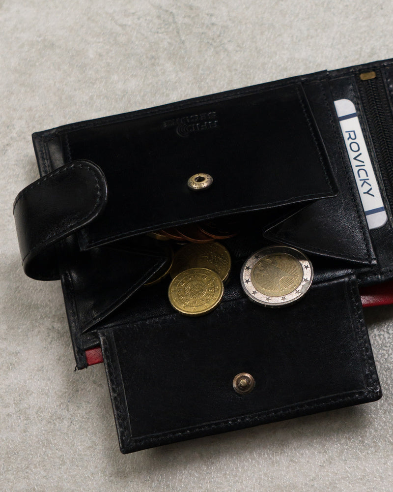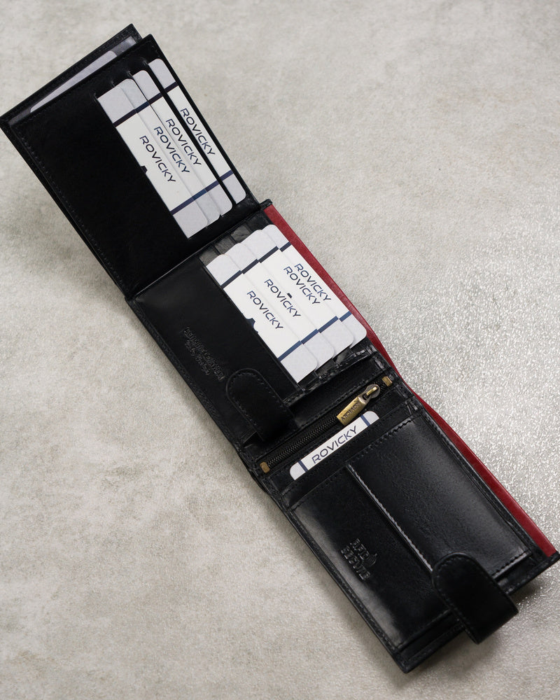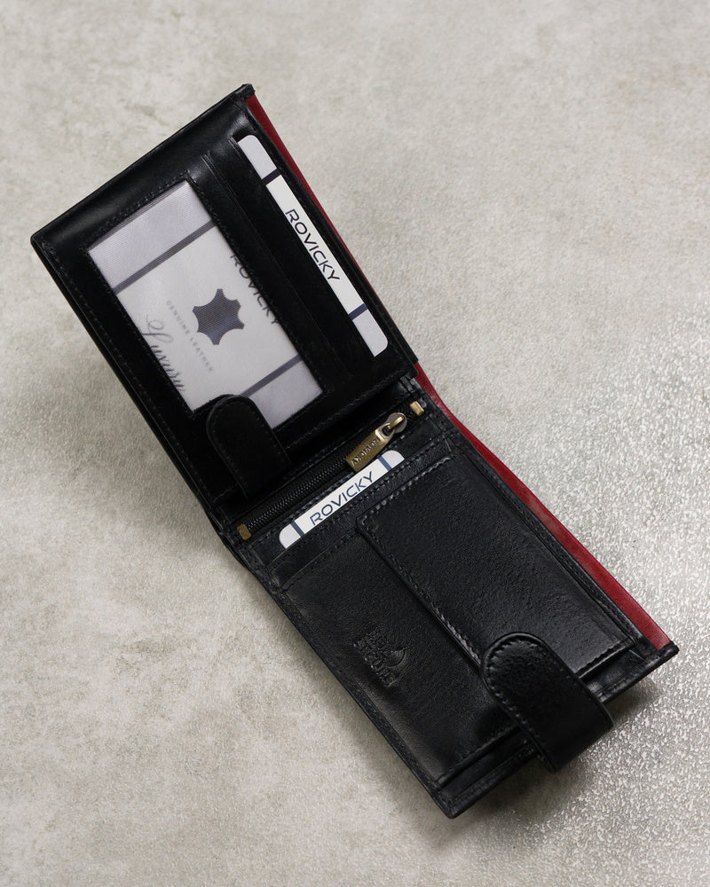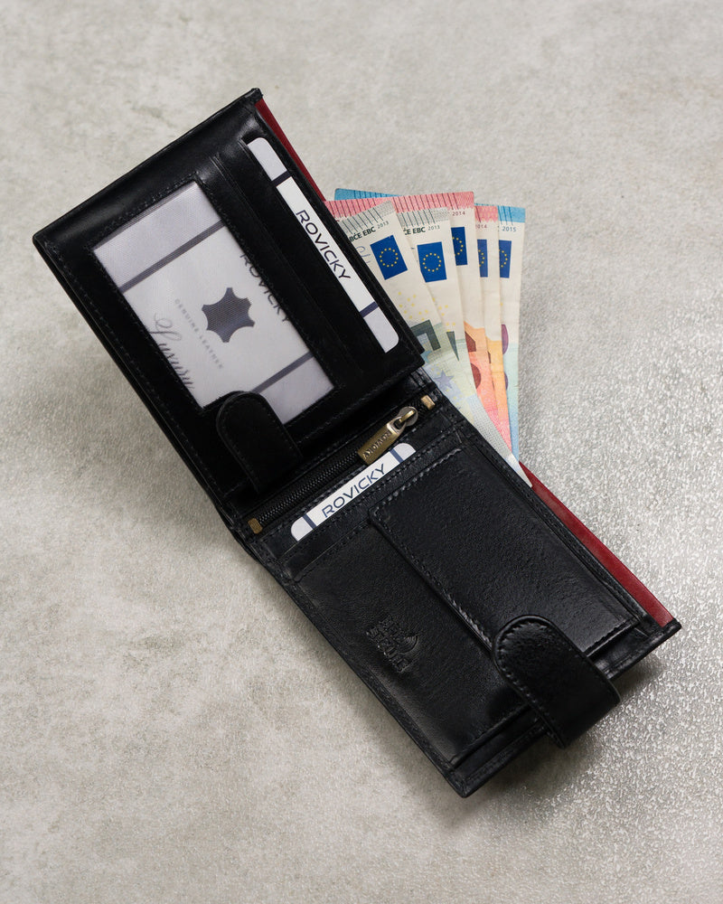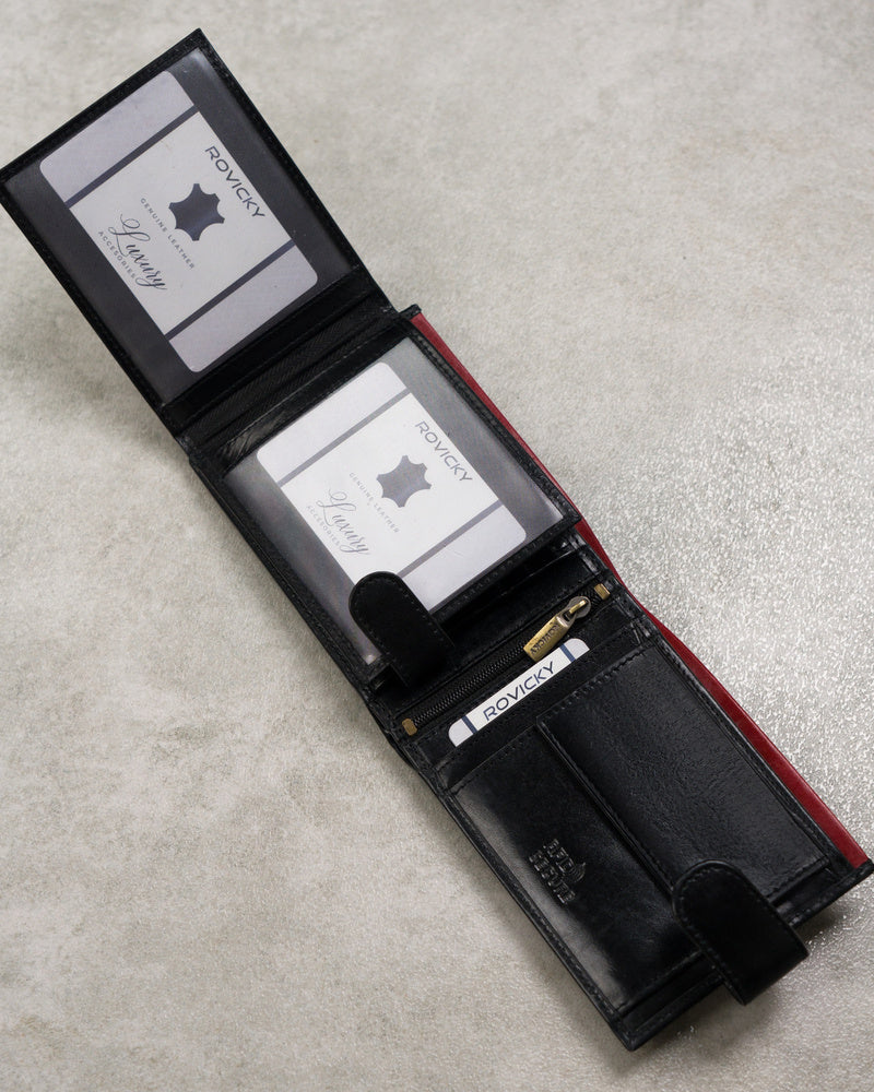 Vīriešu ādas maks Rovicky RV91 ir elegants un funkcionāls aksesuārs, kas izgatavots no augstas kvalitātes īstas ādas. Melnā krāsa nodrošina klasisku un daudzpusīgu stilu, kas piemērots jebkuram gadījumam. Makam ir liels izmērs, tāpēc tajā ērti ietilps visas jūsu kartes un skaidra nauda. Ar 6-10 karšu nodalījumiem un RFID aizsardzību jūsu personas dati būs drošībā. Izmēri 9,5 cm x 12,5 cm x 2,5 cm nodrošina, ka maks būs ērts ikdienas lietošanai.