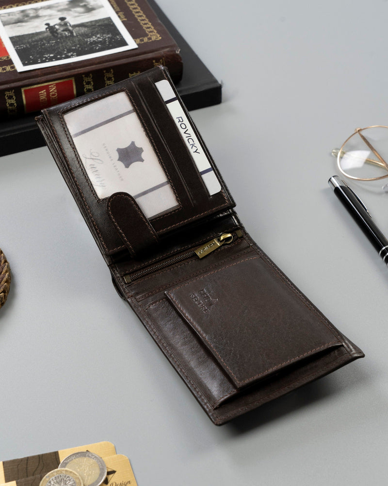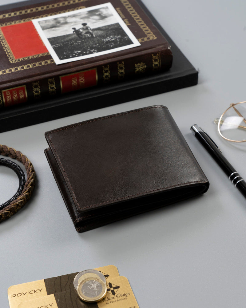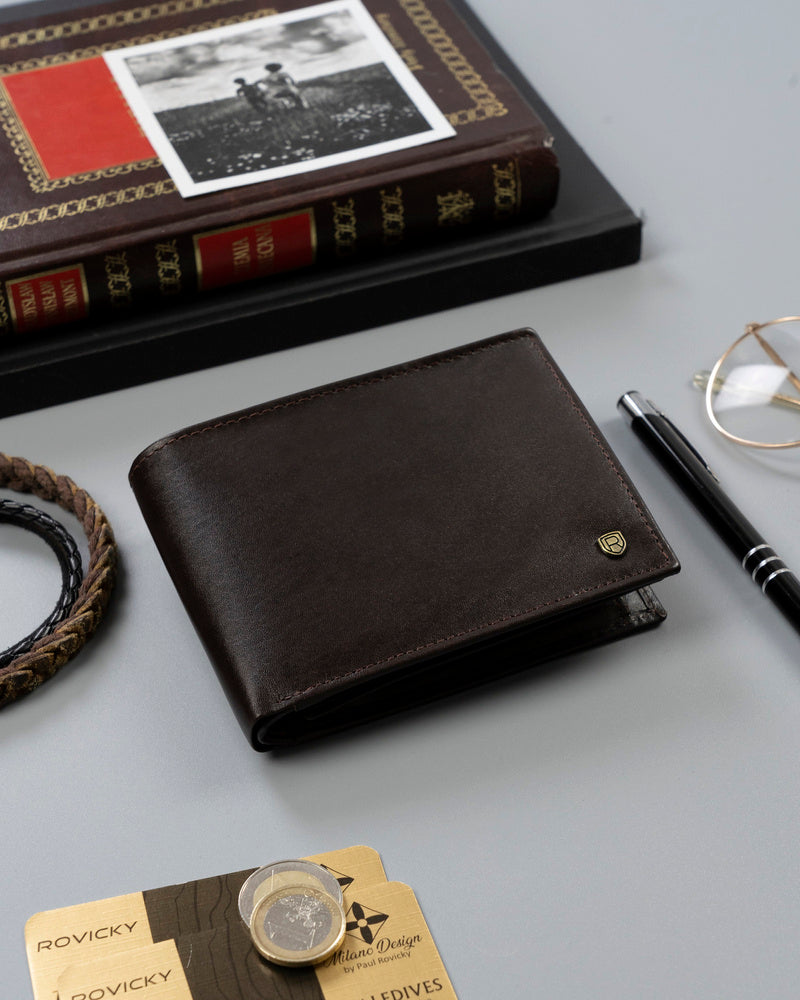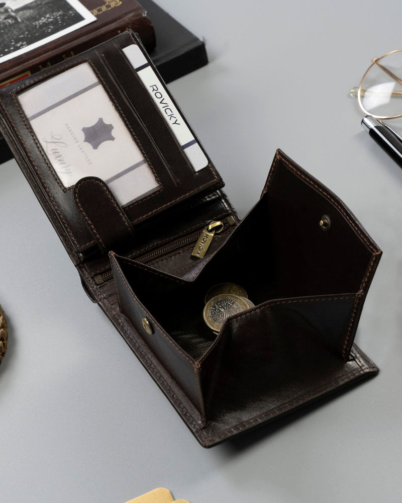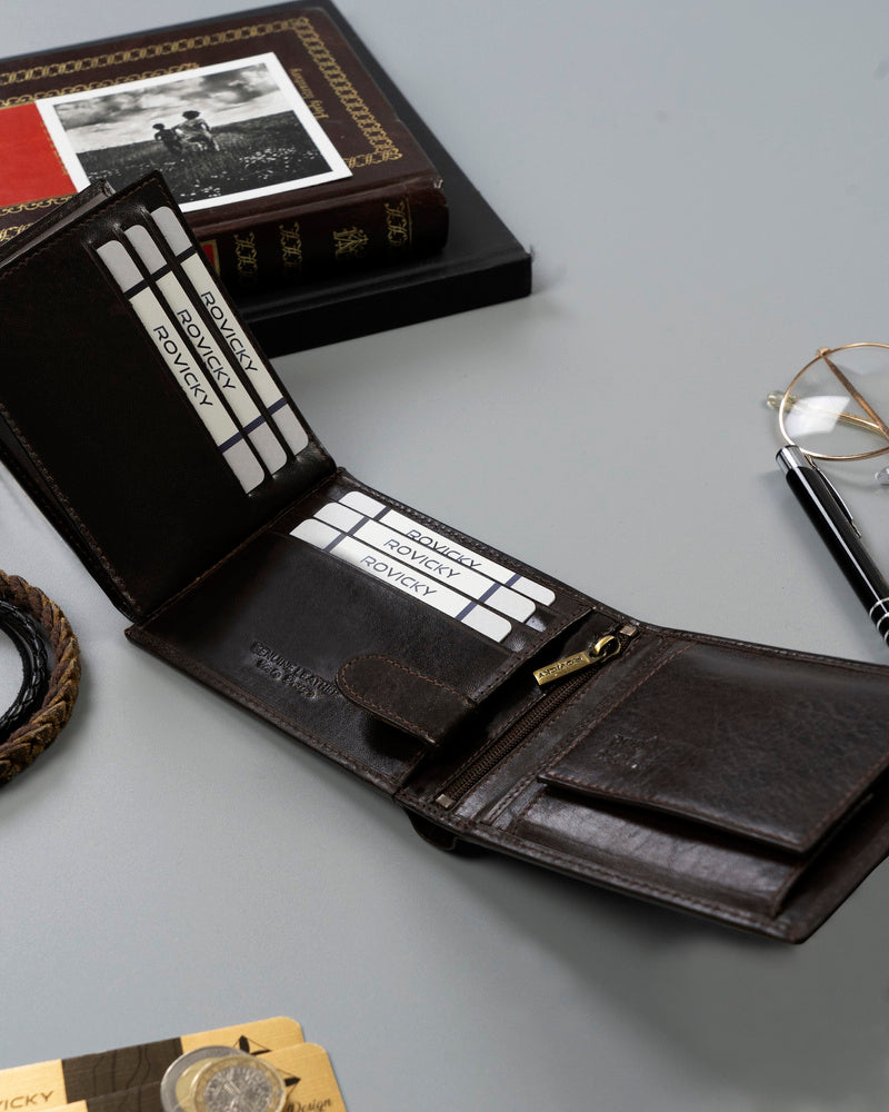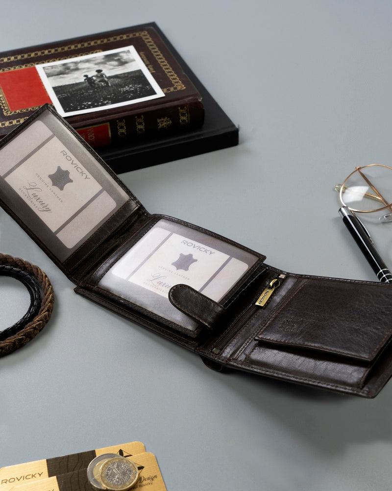 Vīriešu ādas maks Rovicky RV98 ir elegants un funkcionāls aksesuārs, kas izgatavots no augstas kvalitātes īstas ādas. Tumši brūnā krāsa piešķir tam klasisku un izsmalcinātu izskatu. Maks ir liela izmēra, tāpēc tajā ērti ietilps visas jūsu kartes un skaidra nauda. Ar 6-10 karšu nodalījumiem un RFID aizsardzību jūsu personas dati būs drošībā. Kompaktie izmēri (9,5 cm x 12,5 cm x 2,5 cm) ļauj ērti nēsāt maku kabatā vai somā.