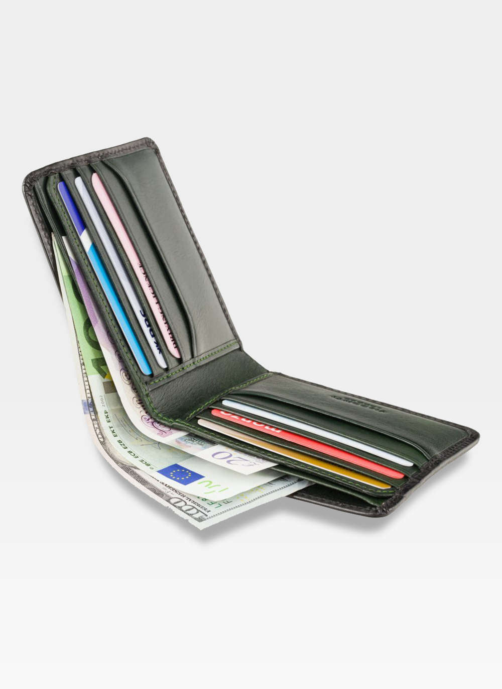- Divas lielas kabatas banknotēm nodrošina pietiekami daudz vietas dažādām valūtām.
