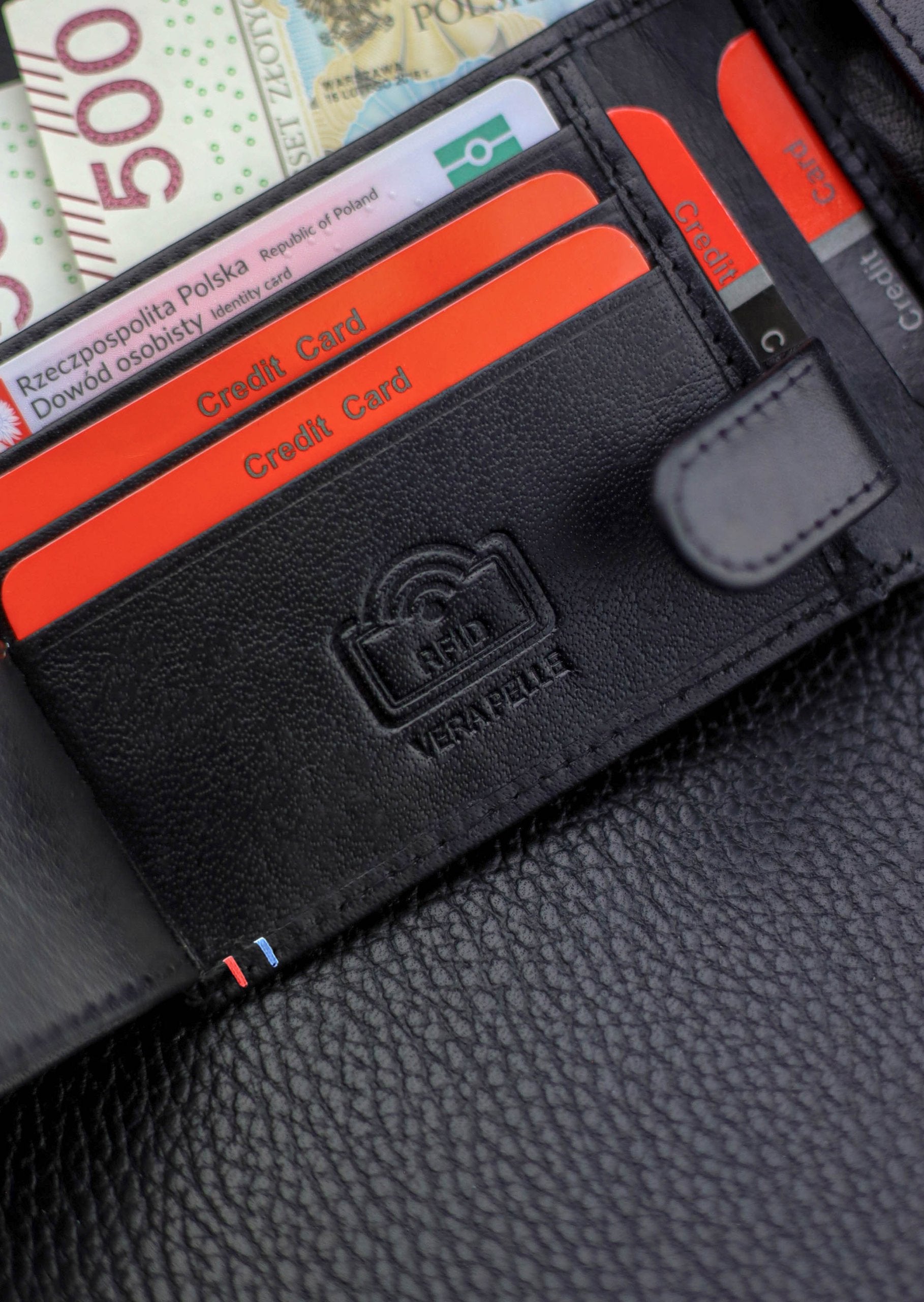 Kartes/dokumenta nodalījums ir nostiprināts ar atloku un spiedpogu — viss kārtīgi paliek savā vietā.