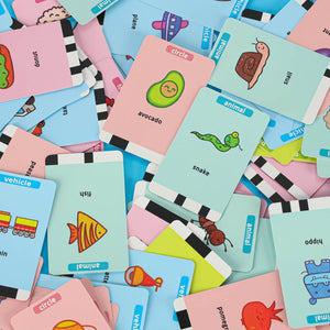 - Iekļautas kartītes ar attēliem un angļu valodas vārdiem, lai veicinātu dabiskas valodas apguvi.