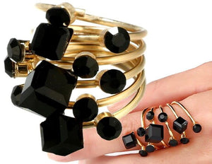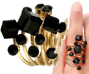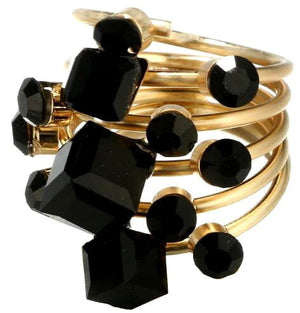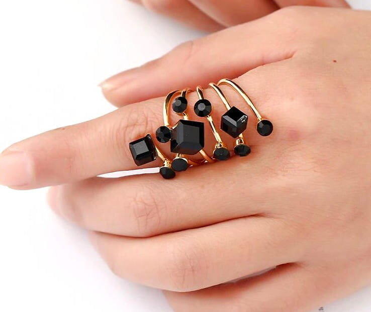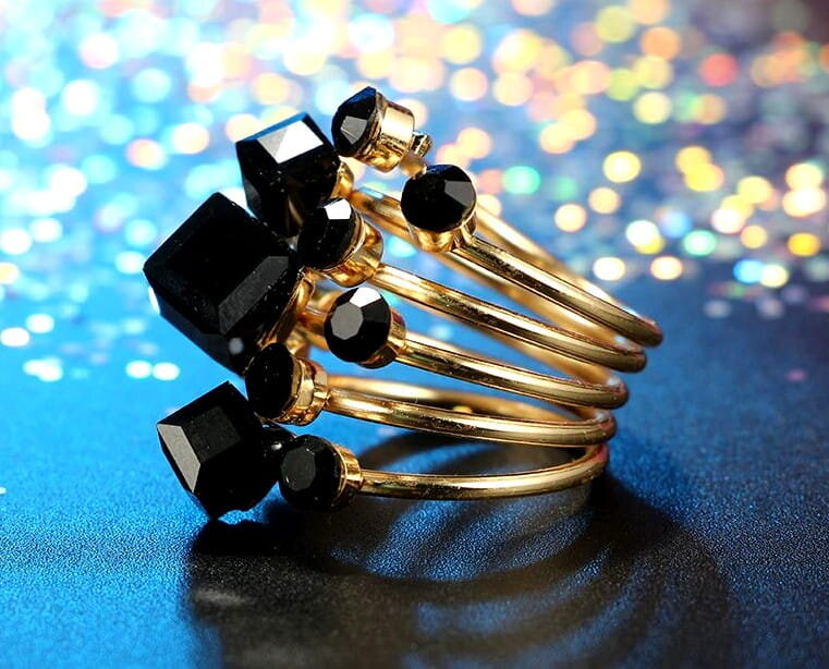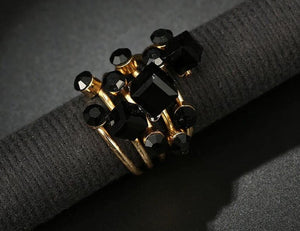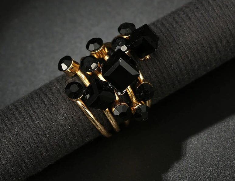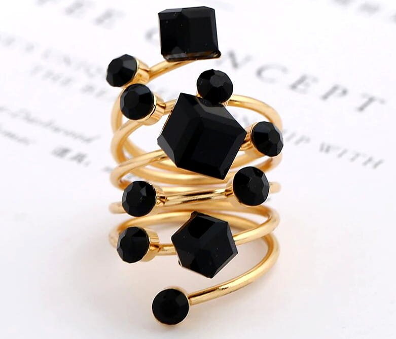 Šis elegantais antīkais gredzens ir izgatavots no apzeltīta metāla un dekorēts ar melniem kristāliem. Tā dizainam ir unikāls stils, kas noteikti piesaistīs uzmanību.