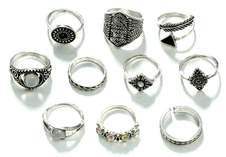 Šis 10 gredzenu komplekts ir izgatavots no augstas kvalitātes metāla spīdīgā sudraba krāsā. Gredzeni tiek pārdoti komplektā ar iekšējo platumu no 16 mm līdz 18 mm.