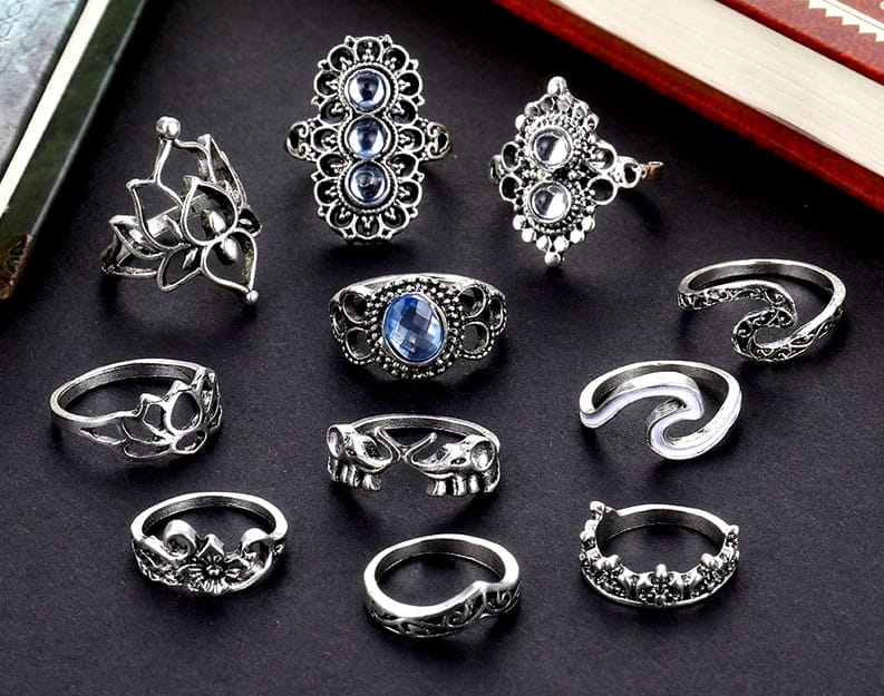 Komplektā ietilpst dažādi gredzeni, tostarp laulību gredzeni, kas imitē čūsku, un tādi, kas dekorēti ar ažūra ziediem un sintētiskiem cirkoniem. Šis pankroka stila gredzenu komplekts ir lieliska izvēle pusaudžiem, kas meklē modernus un rūpīgi izstrādātus aksesuārus.