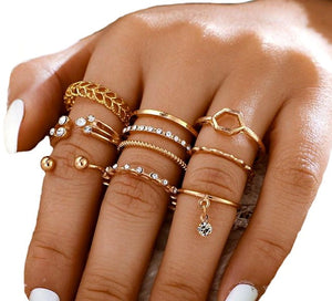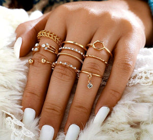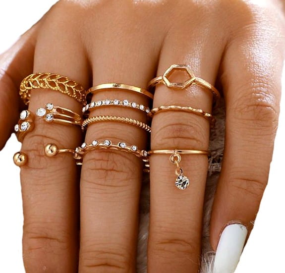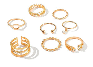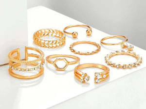 Šis 8 gredzenu komplekts ir izgatavots no augstas kvalitātes metāla un pārklāts ar zeltu. Katram gredzenam ir antīks retro stils, kas piešķir unikalitāti un eleganci.