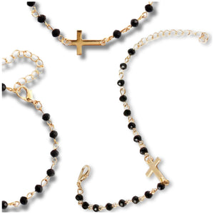 Apzeltīta rokassprādze ar melnām pērlītēm un krustu, ķirurģiskais tērauds