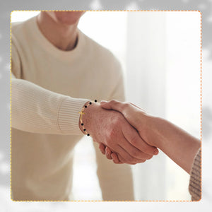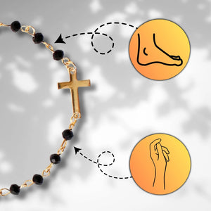 Eleganta rokassprādze, kas izgatavota no ķirurģiskā tērauda, pārklāta ar 18 karātu zeltu. Melnas, spīdīgas pērlītes un krusts piešķir tai unikālu dizainu. Aproce ir izturīga pret koroziju un hipoalerģiska, tāpēc piemērota cilvēkiem ar alerģijām.