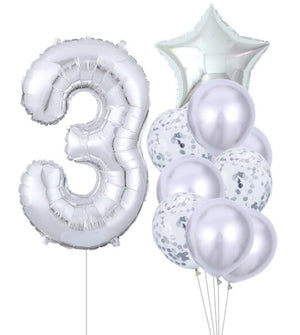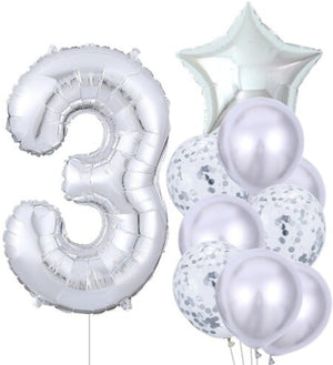 Komplektā ietilpst 10 dažādu izmēru un formu baloni. Komplektā ietilpst uzmanību piesaistošs liels folijas balons cipara trīs formā, zvaigznes formas izstrādājums un astoņi klasiski lateksa baloni. Daži izstrādājumi ir caurspīdīgi un pildīti ar smalku sudraba konfeti.