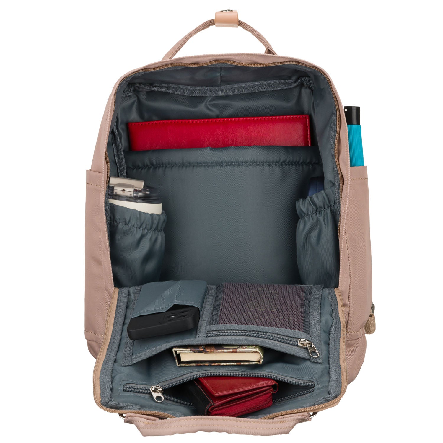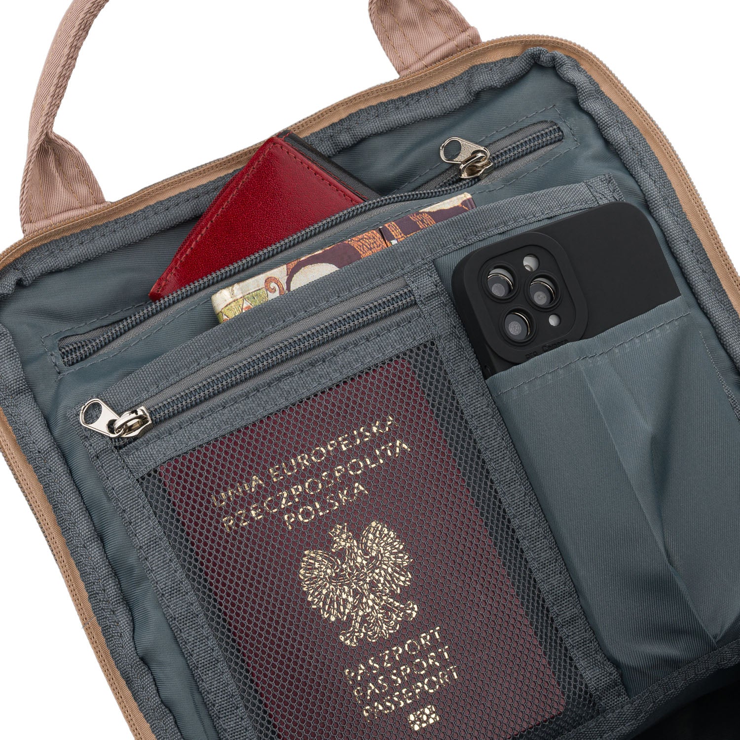 Peterson liela sieviešu mugursoma, bēšā krāsā – praktiska izvēle, ja nepieciešama ietilpīga, kārtīgi organizēta mugursoma, kas piemērota ikdienas lietošanai.