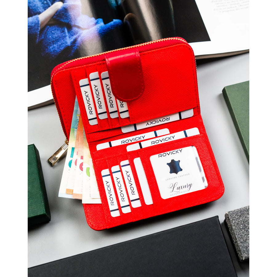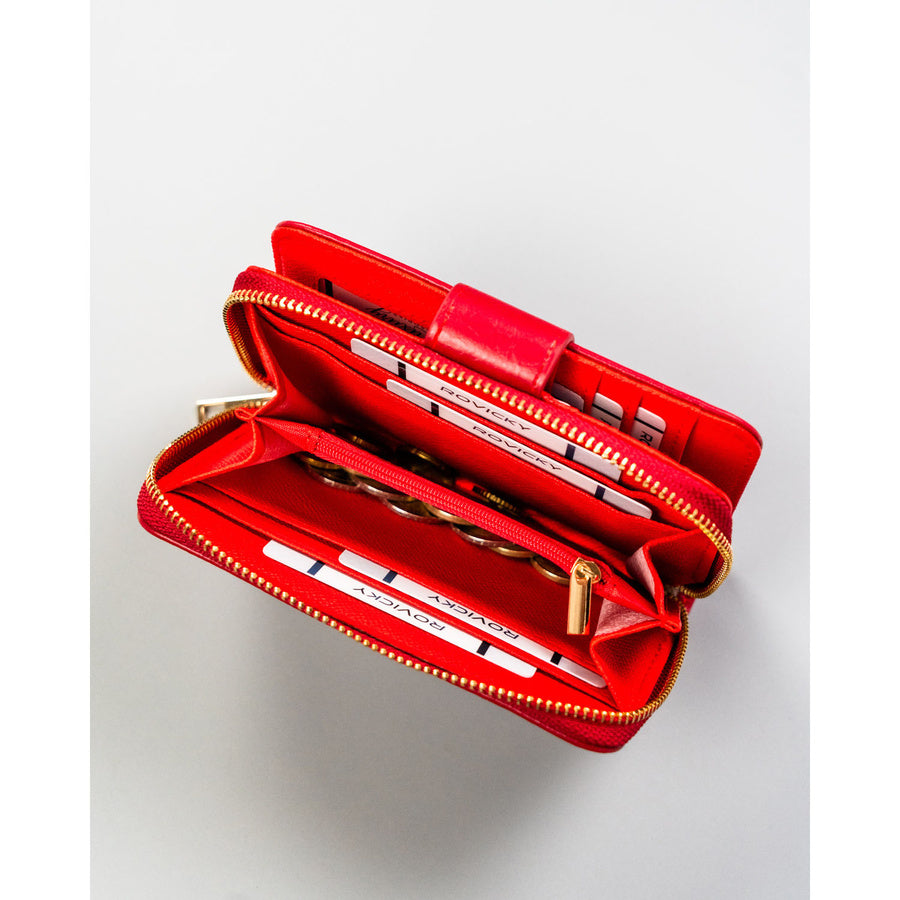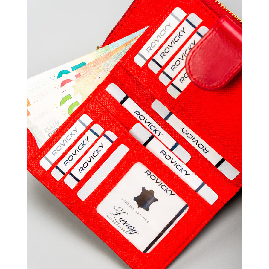 Didelė, horizontalaus formato moteriška piniginė iš ekologiškos odos. Raudona spalva ir subtili vertikali tekstūra padeda greitai rasti piniginę rankinėje ir patogiai naudoti kasdien.