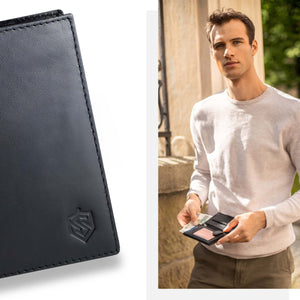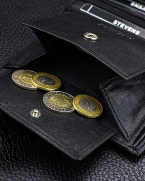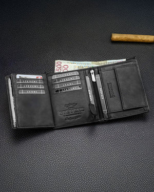 Elegants STEVENS® komplekts dāvanu kastītē. Klasiska dabīgās ādas maka un dabīgās ādas jostas kombinācija – praktiska, izturīga un piemērota jebkuram gadījumam.