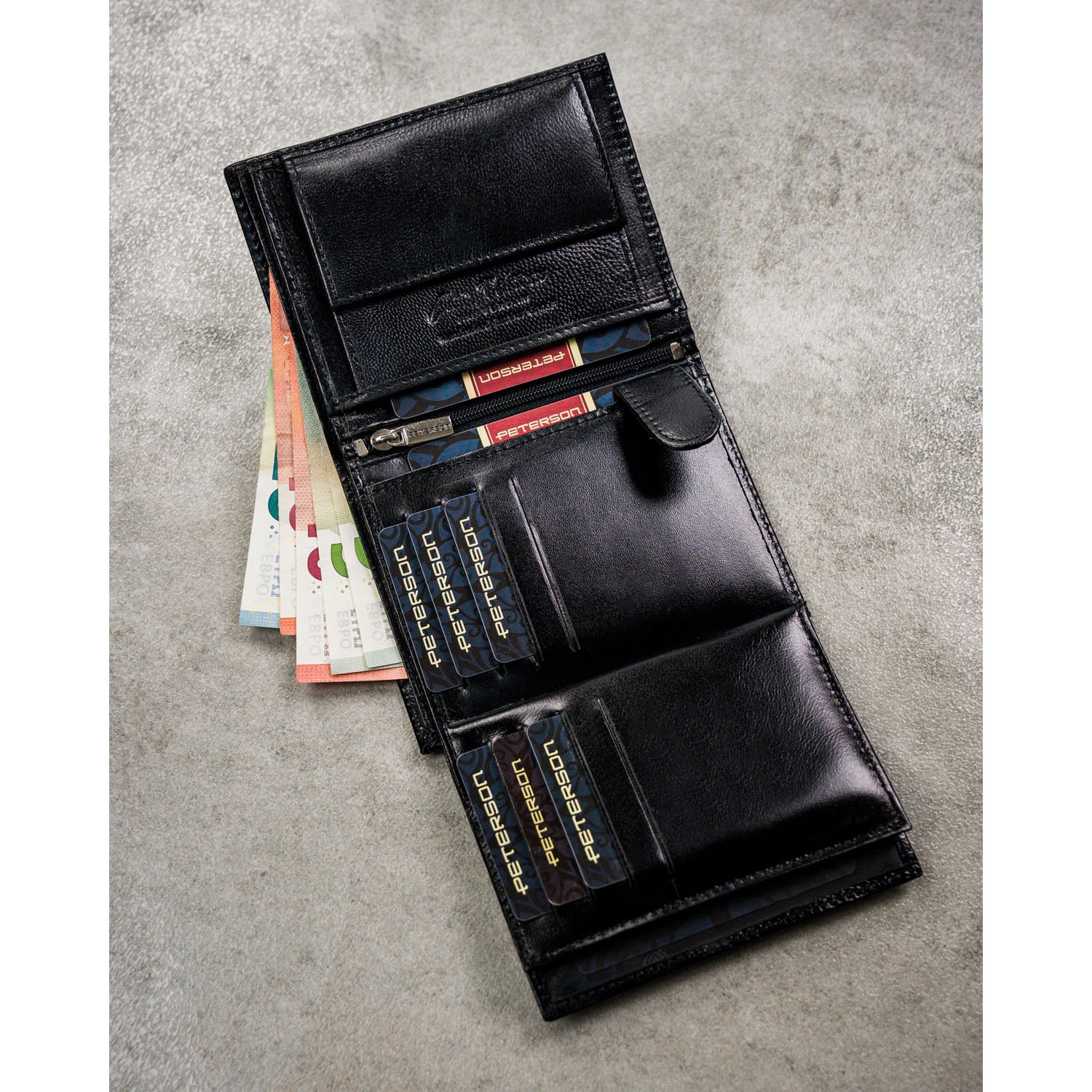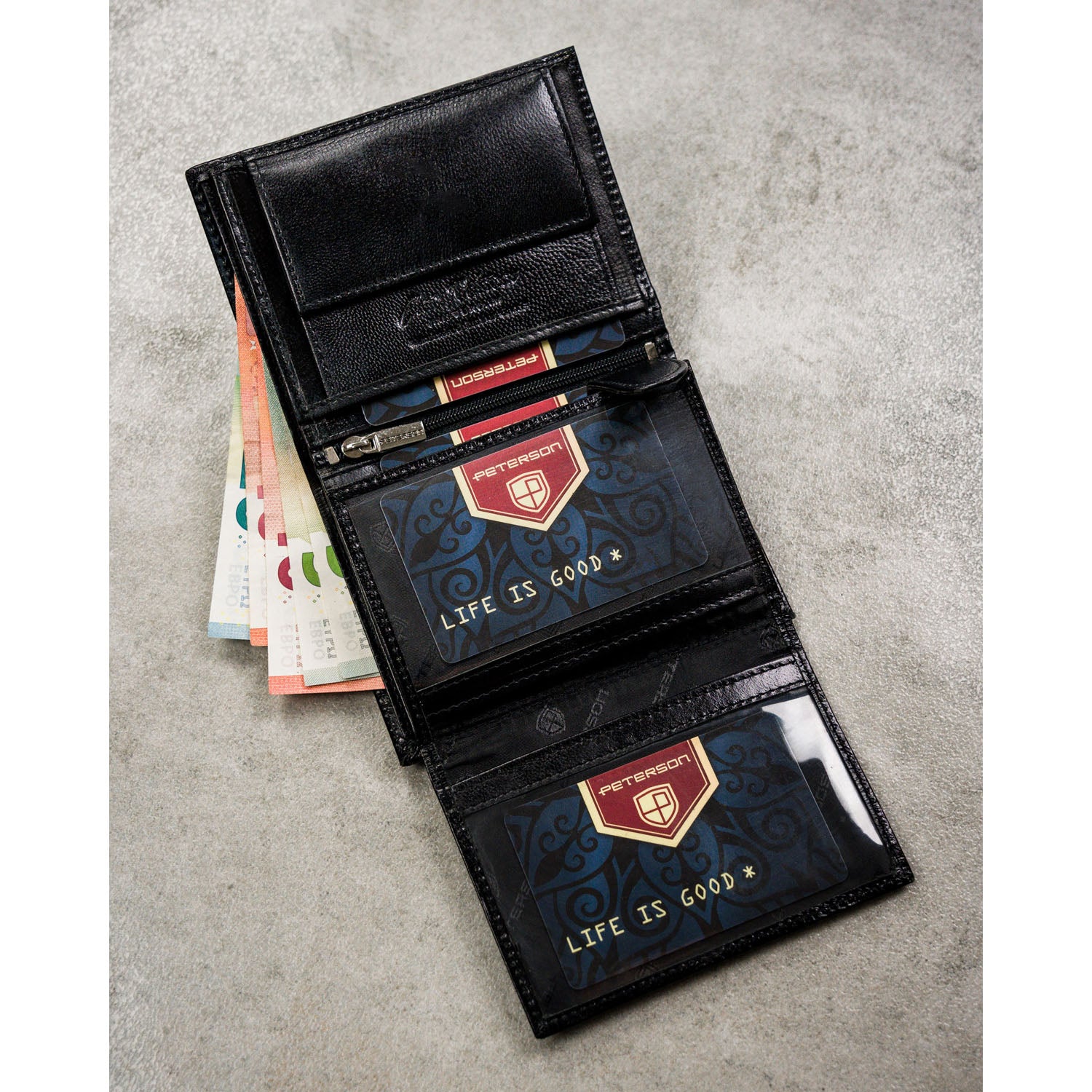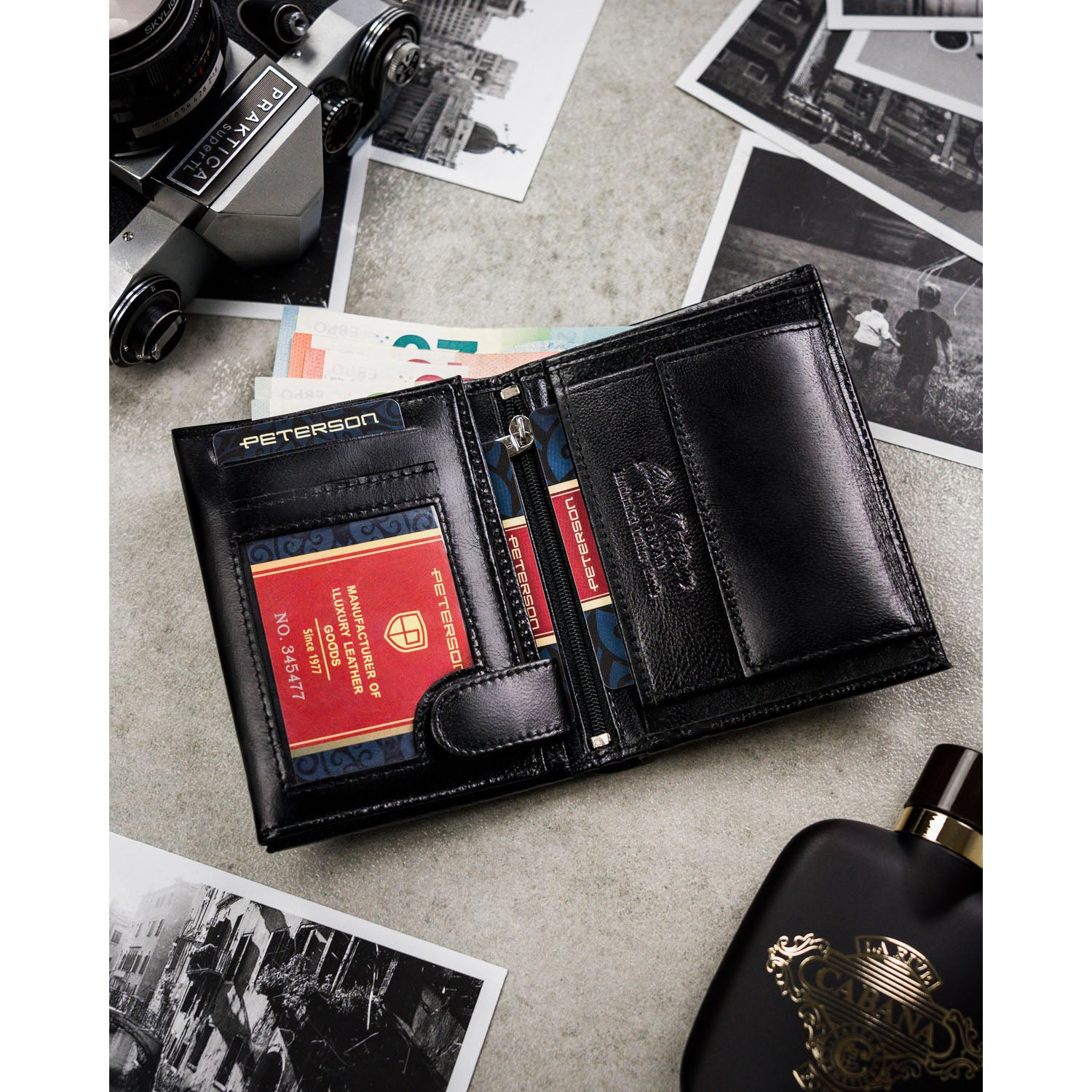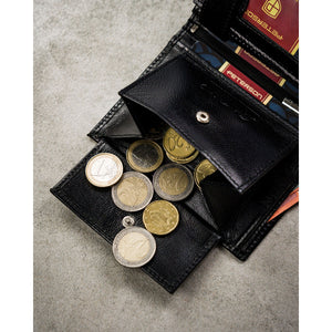 Droši nostiprināta monētu kabata un labi izvietotas karšu atveres ļauj droši uzglabāt visas nepieciešamās lietas. Šī ir praktiska izvēle vīrietim, kurš novērtē glītu aksesuāru izvietojumu un ērtu lietošanu.