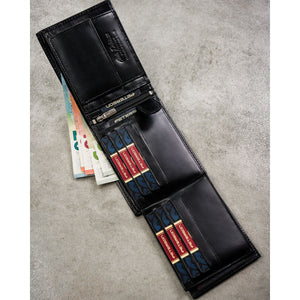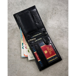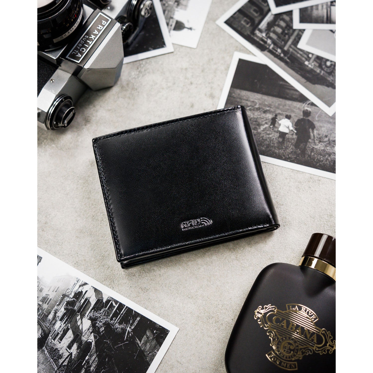 Vyriška piniginė pagaminta iš tikros, lygios faktūros natūralios odos. Ji maloni liesti, patvari ir išlaiko klasikinę išvaizdą ilgus metus. Integruota RFID apsauga apsaugo bekontaktes mokėjimo korteles nuo nepageidaujamo nuskaitymo.
