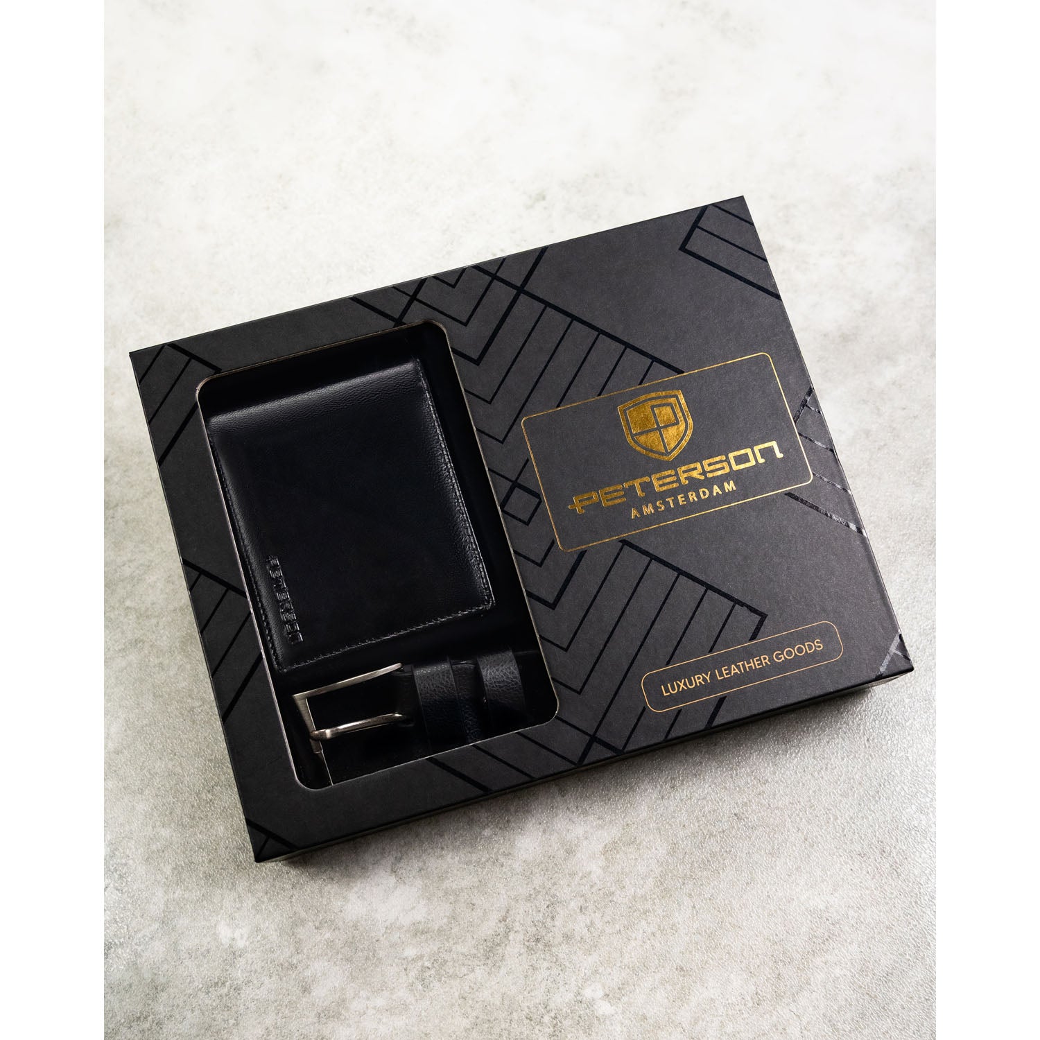 Dovanų rinkinys vyrams: natūralios odos piniginė su RFID apsauga + reguliuojamas diržas Peterson