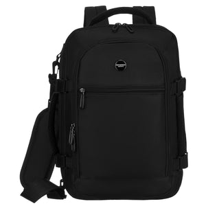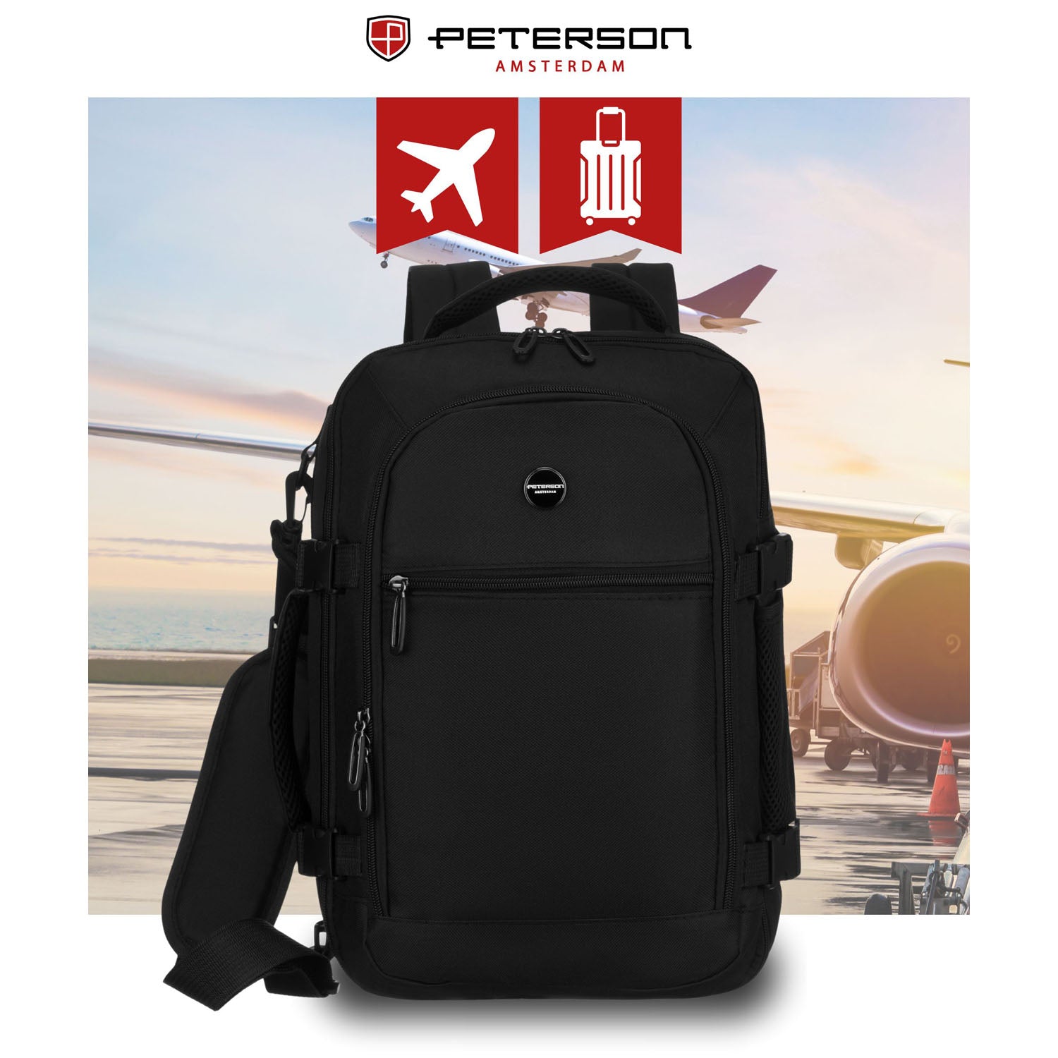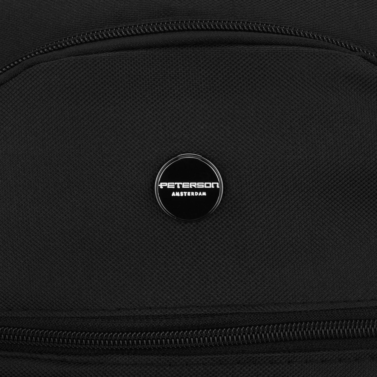 Melna unisex pilsētas mugursoma Peterson - praktiska un ietilpīga mugursoma ikdienas lietošanai. Izgatavota no izturīga poliestera, piemērota gan sievietēm, gan vīriešiem, ērti ievieto A4 formāta dokumentus un ikdienas priekšmetus.