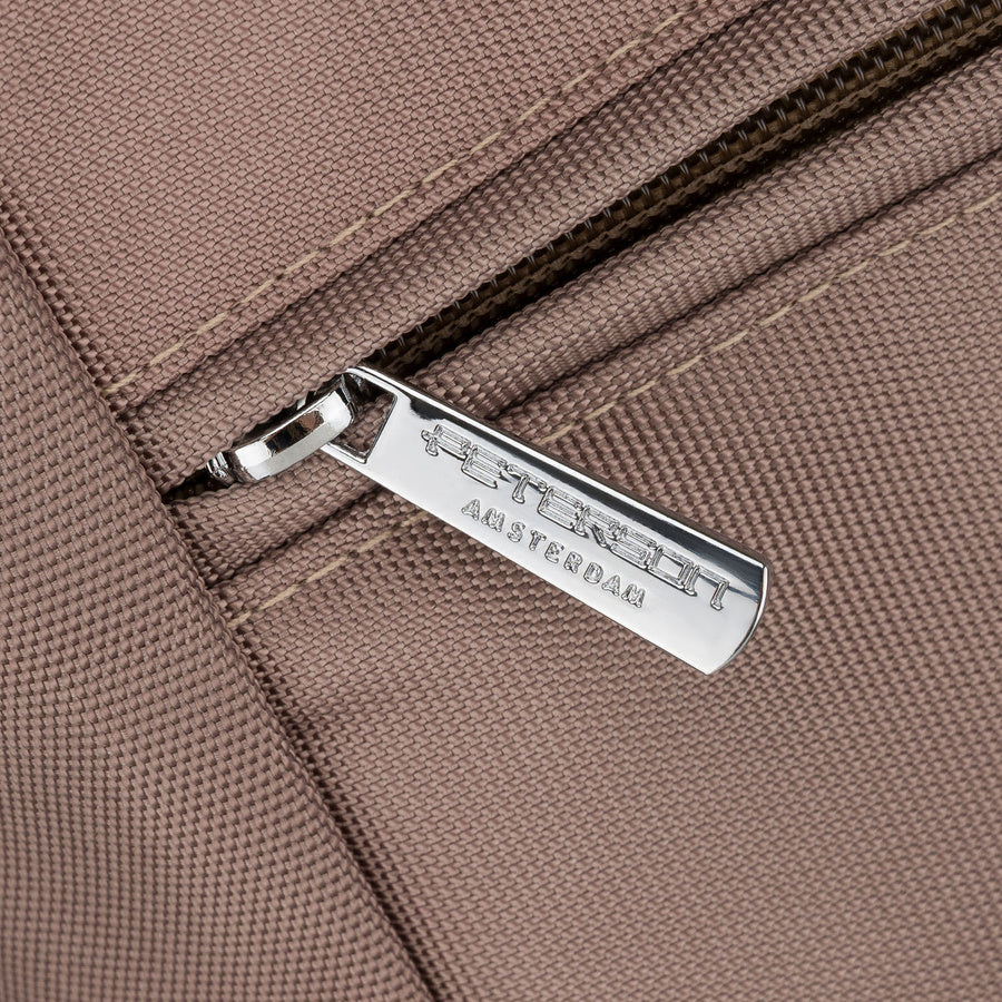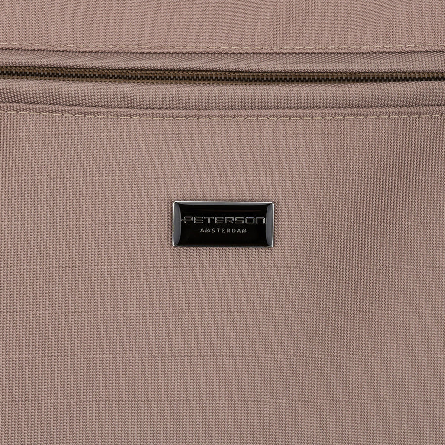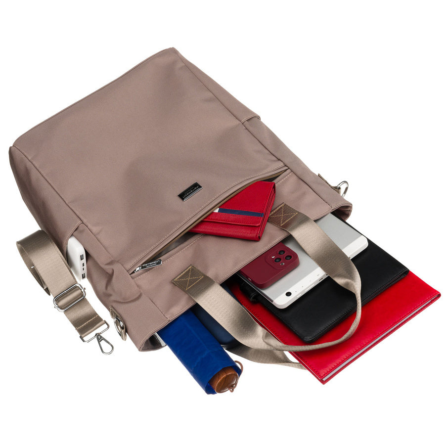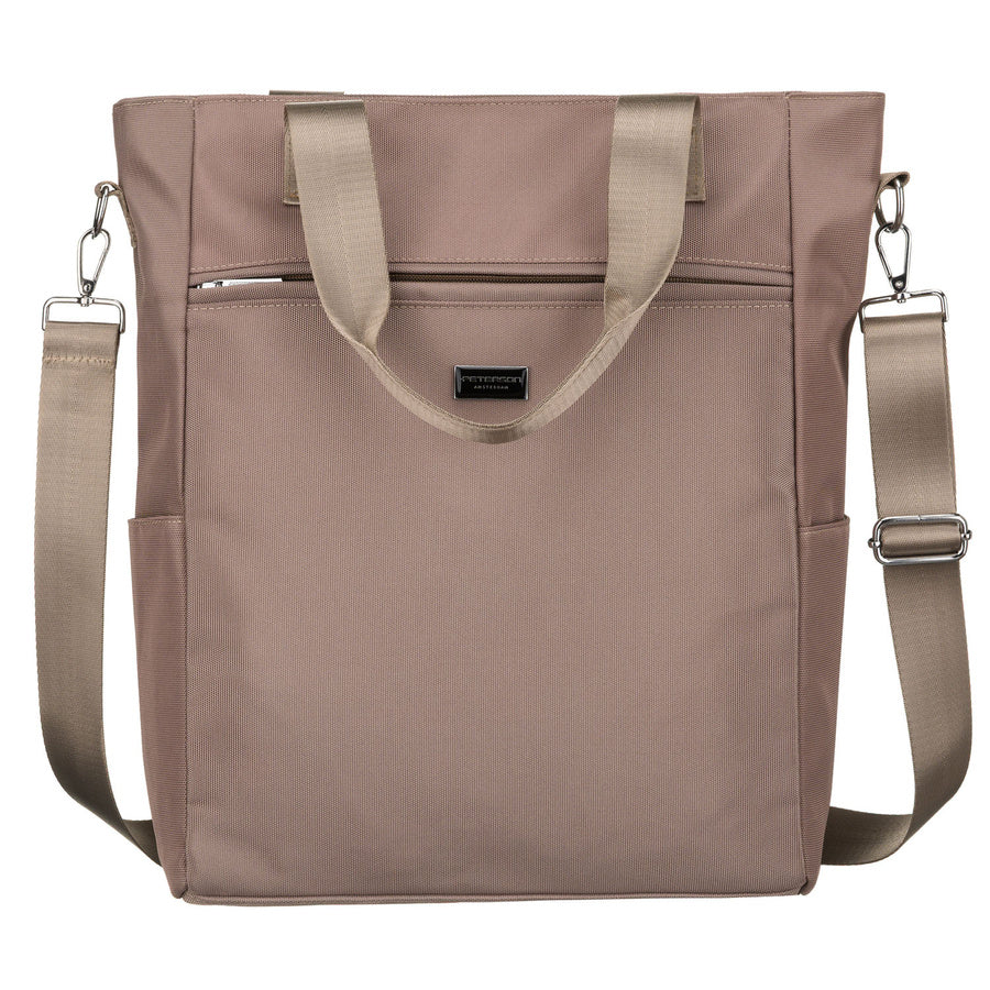 Moteriška smėlio spalvos „Peterson“ shopper rankinė su rankenomis ir nuimamu dirželiu, užsegama užtrauktuku P30