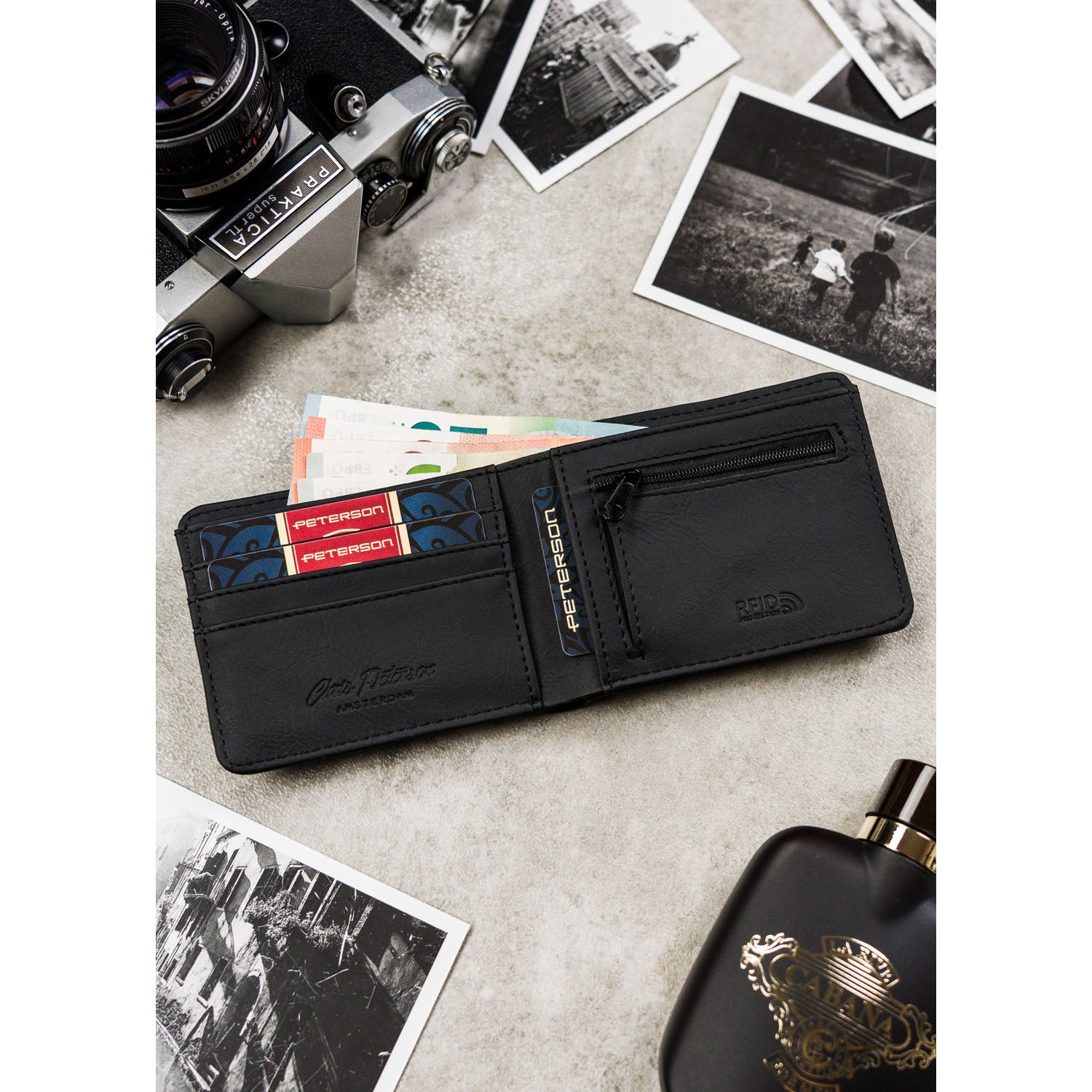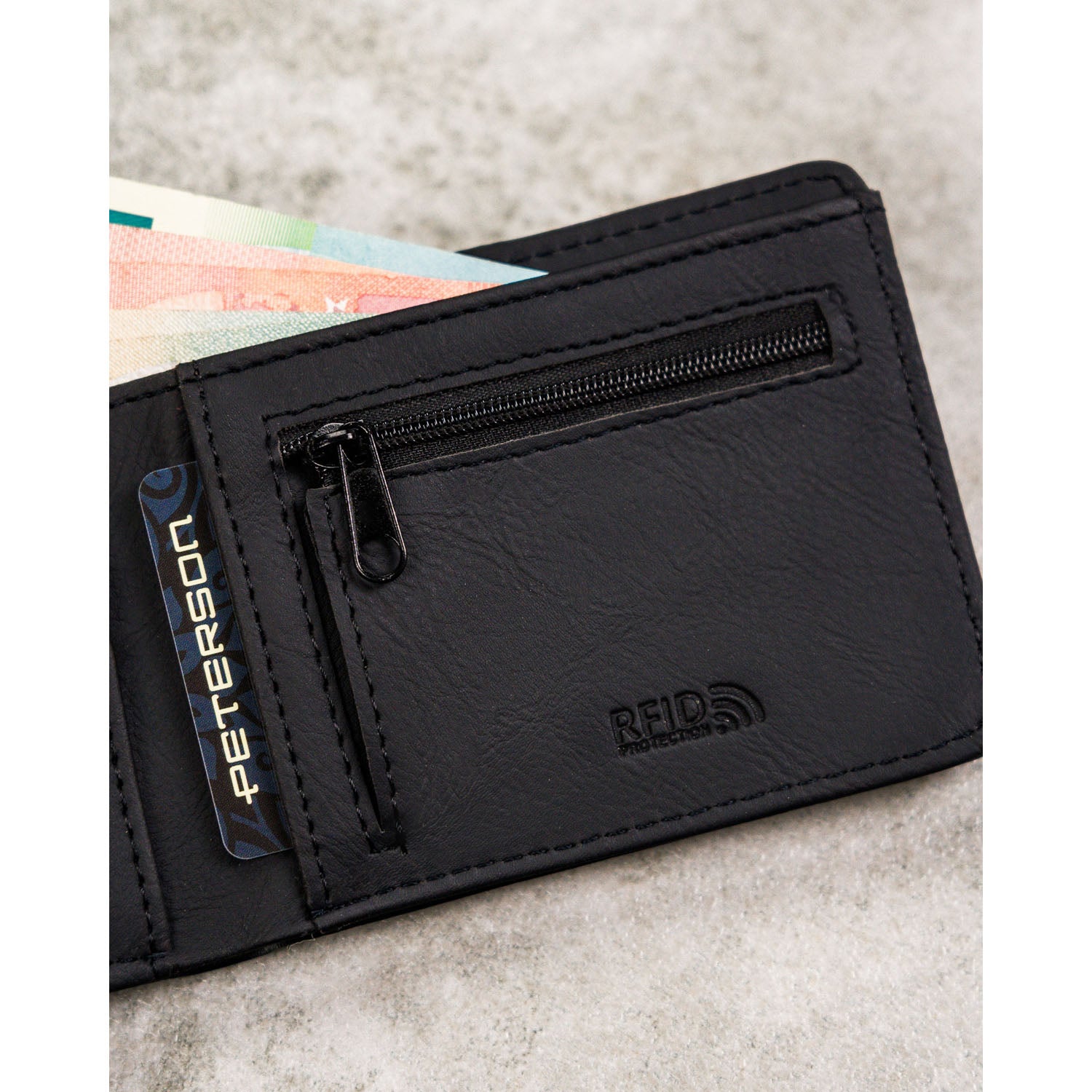 Peterson vīriešu rokassoma, izgatavota no mākslīgās ādas, melnā krāsā, ar RFID aizsardzību.