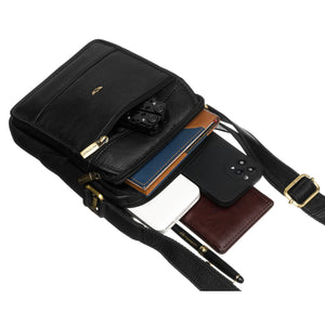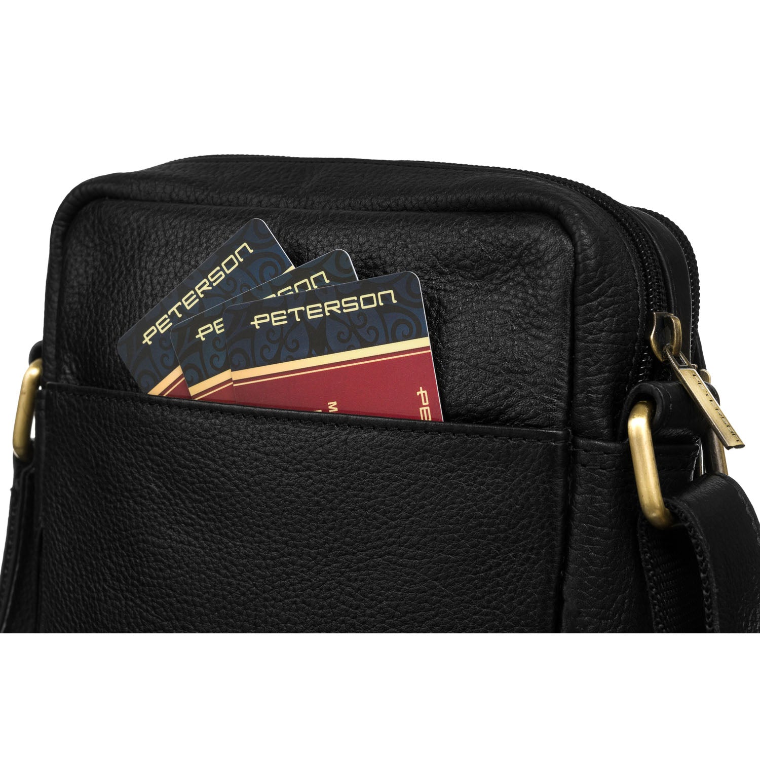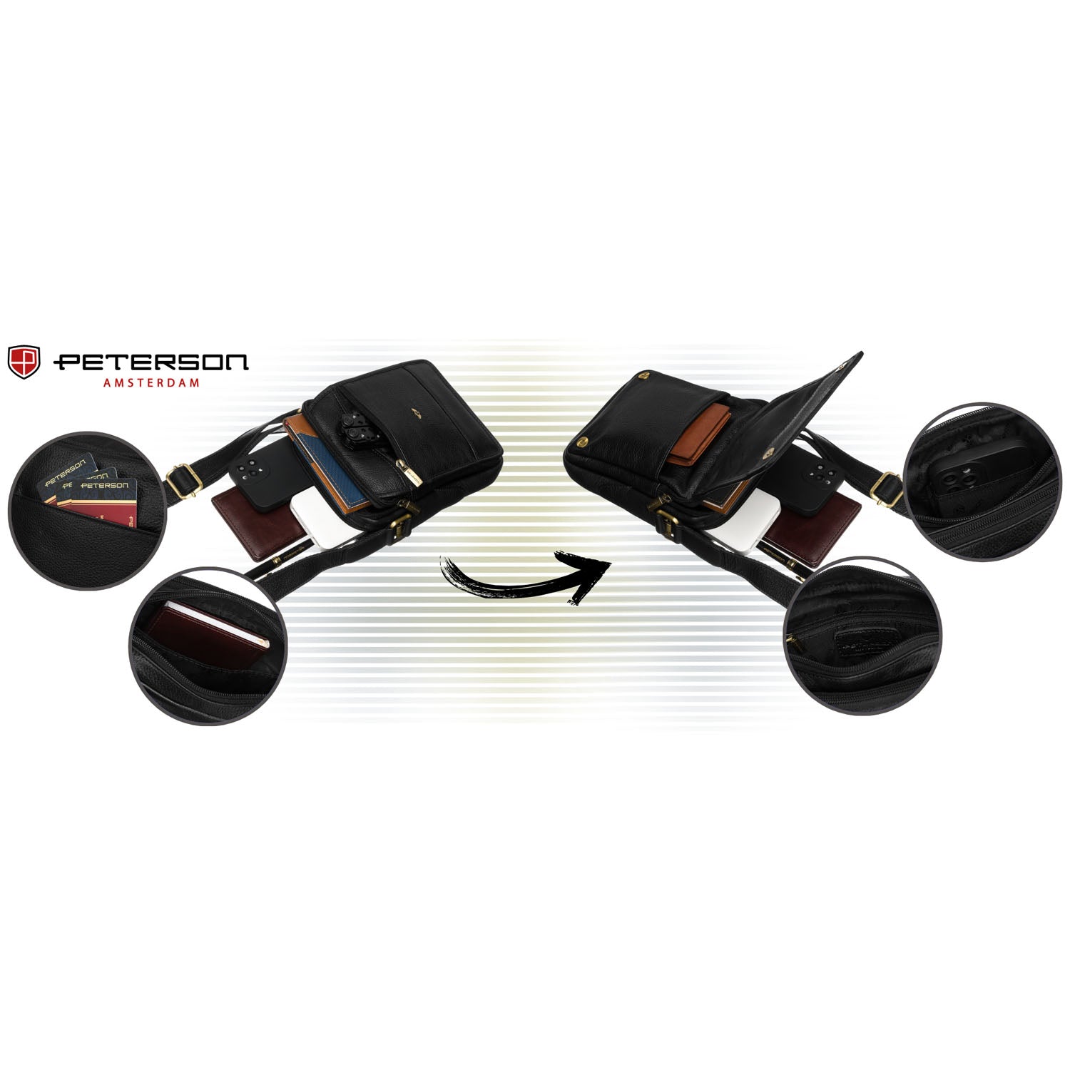 Peterson vīriešu soma no dabīgas ādas, melnas krāsas, ar divām nodalījumiem un sešām kabatām.