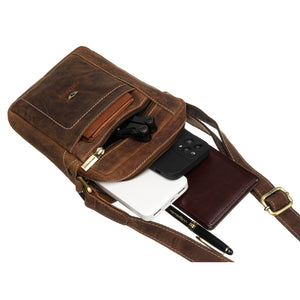 Peterson vīriešu soma no dabīgas ādas, brūnā krāsā, ar vienu nodalījumu un piecām kabatām. Regulējama siksna līdz 155 cm.