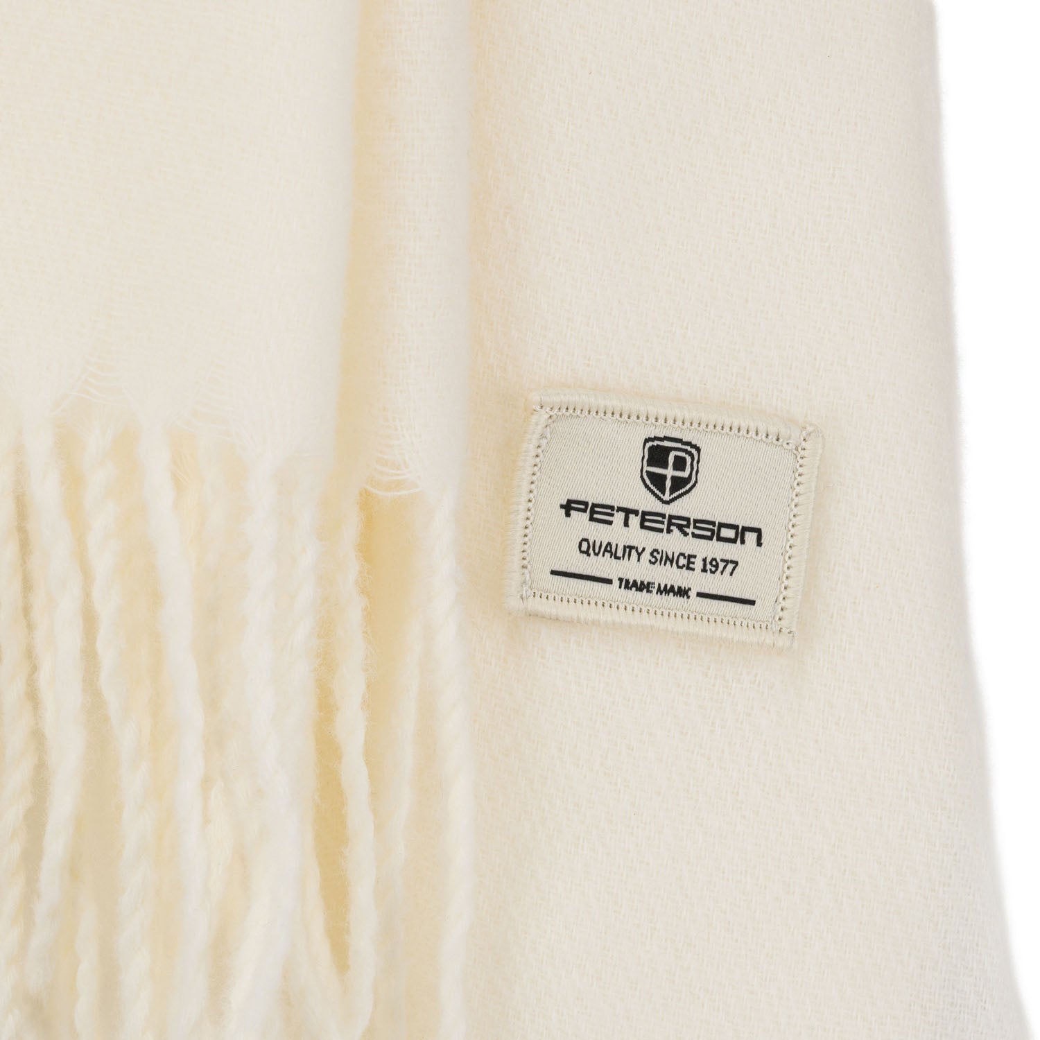 Baltā Peterson šalle no 100% poliestera – lieliski piemērota rudens, ziemas un pavasara sezonai.