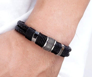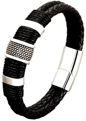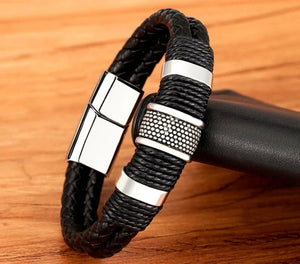 Šī ādas rokassprādze ar nerūsējošā tērauda aizdari ir elegants un uzmanību piesaistošs aksesuārs, kas labi sader ar dažādiem stiliem un tērpiem.