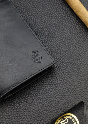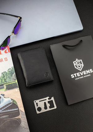 Dāvanu komplekts vīriešiem – STEVENS ādas maks ar RFID aizsardzību, izdzīvošanas karte un dāvanu maisiņš 326
