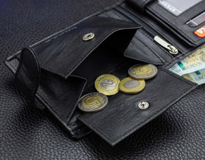 Šis elegantais melnais maks ir izgatavots no īstas matētas ādas. Tas ir kompakts, tomēr ietilpīgs: