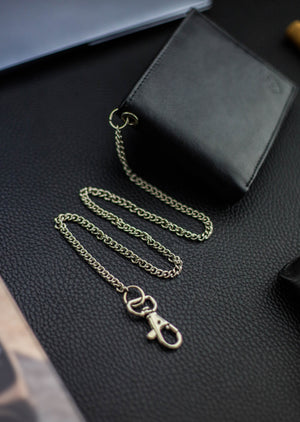 Šis elegantais vīriešu maks ir izgatavots no augstas kvalitātes īstas kazas ādas un tam ir metāla ķēdīte ar karabīni papildu drošībai. Maks ir iepakots stilīgā kastītē, padarot to par lielisku dāvanu.
