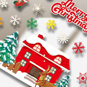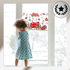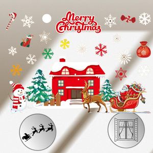 Šī Ziemassvētku uzlīme logam ir ideāli piemērota svētku sezonai. Uz tās ir attēlots Ziemassvētku vecītis ar ziemeļbriežiem, māju, sniegavīru un sniegpārslām, kas jūsu mājām piešķirs svētku noskaņu.