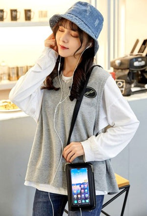 • Zem magnētiskā atloka atrodas divi nodalījumi ar rāvējslēdzēju un viens caurspīdīgs nodalījums, kas ļauj kontrolēt tālruni, neizņemot to no somas.